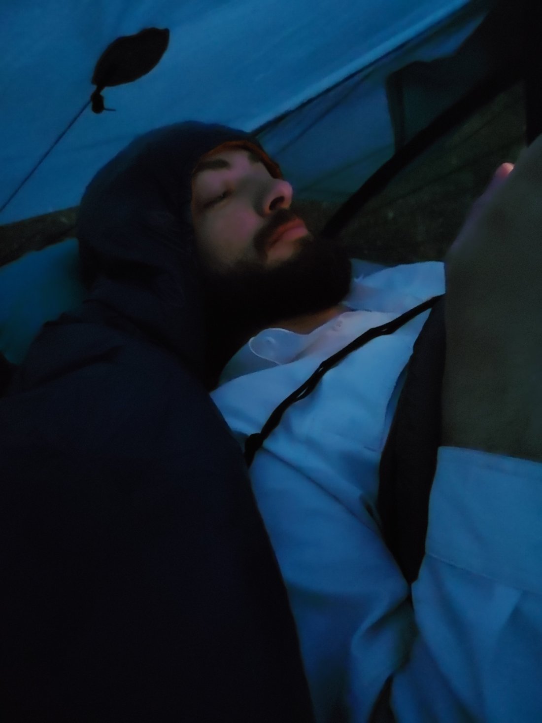 We retired early to our tent- but hard to fall asleep after an accidental zero day!(Woke up to Matthew too cold to be without a hood, too warm or lazy to put on the fleece)