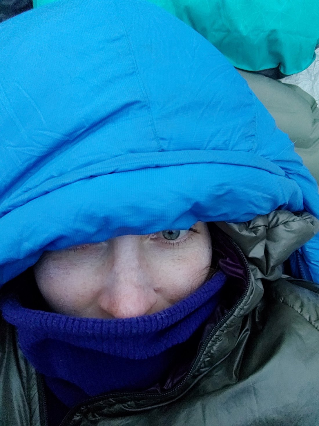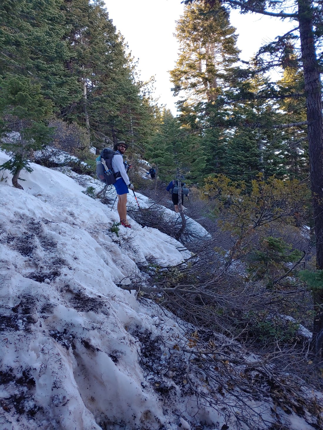 Eventually we came to mile 187, which we were told starts a really sketchy 3 mile stretch. It wasn’t terrible until around 188.5, where we started walking in straight up snow. It was fun and exciting at first, but got really old really quickly! Around mile 189.5, it straight out sucked! When the trail was blazed in the snow this year, it apparently crossed through thick, tall bushes, so we were forced to climb over, under, and through them. We were sliding (I slipped twice, casually landing on my butt both times!) and postholing (where your foot suddenly falls through the snow- so scary and annoying!) and growing more tired and sore.