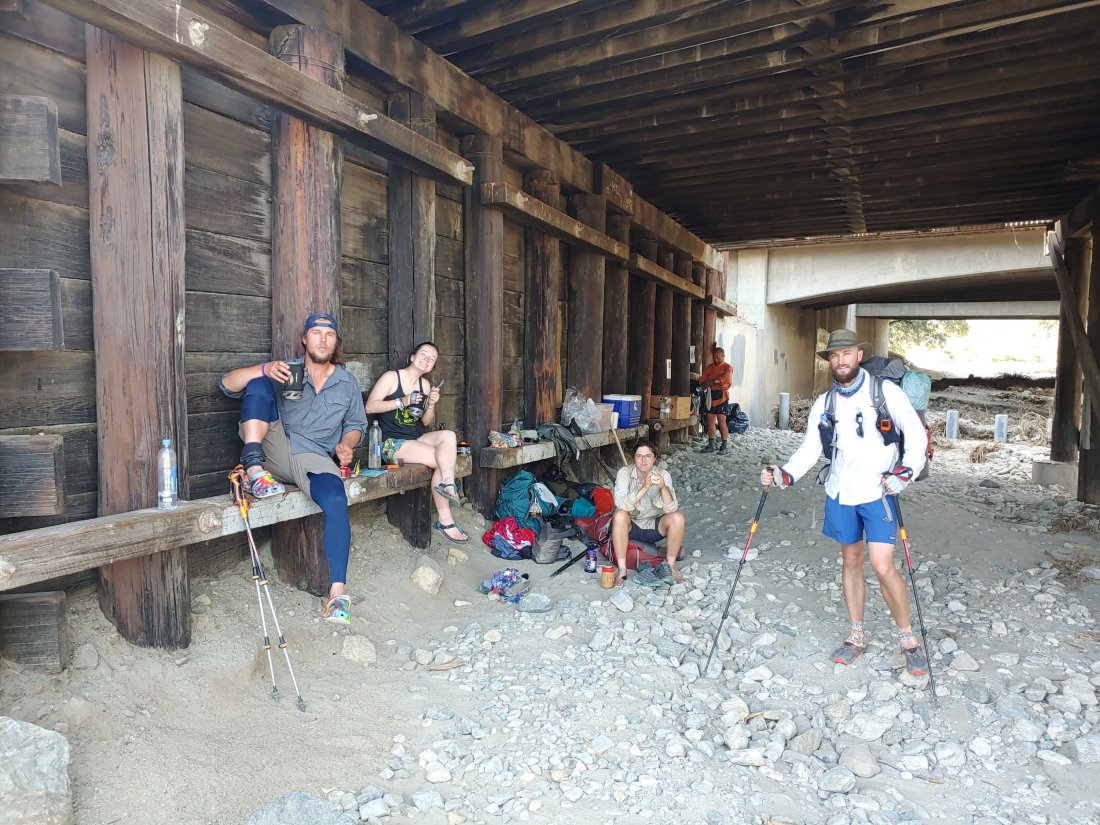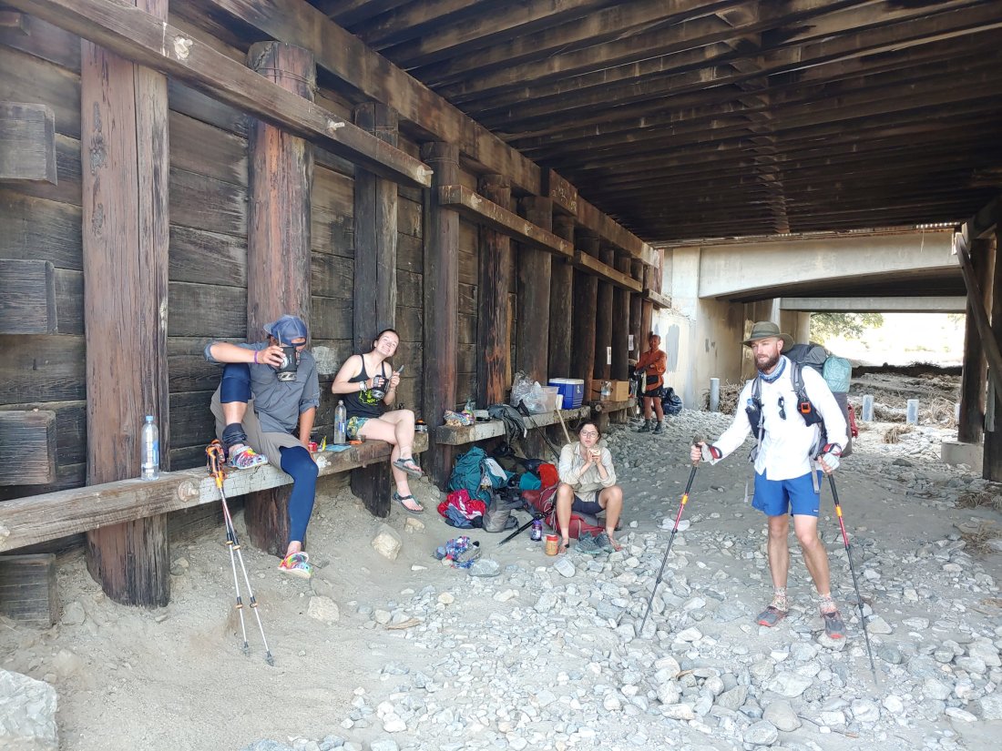 Holy hell those last 3 miles were torture!! About 1 mile down hill on a paved road, then 2 miles of crawling through soft, NJ-like, impossible to walk in, sand. By the time we reached the I-10 underpass I was shot- and the trail magic cooler was empty! 😦 I did steal some sugar free apple cider packets, which later we found out they were left by Columbia! Matt enjoyed some tortilla chips from an already opened, half-eaten bag, and Yaara showed up and made herself a peanut butter and jelly tortilla from things she found under the bridge! When you thru-hike, your standards drop big time.