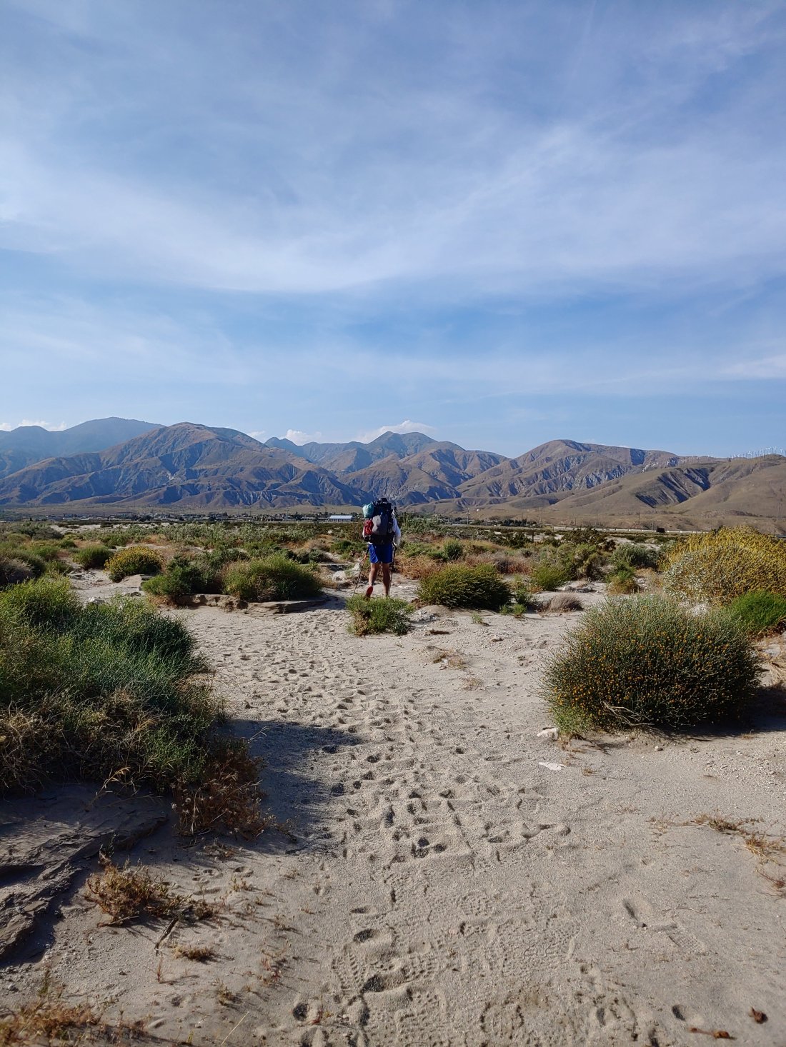 Holy hell those last 3 miles were torture!! About 1 mile down hill on a paved road, then 2 miles of crawling through soft, NJ-like, impossible to walk in, sand. By the time we reached the I-10 underpass I was shot- and the trail magic cooler was empty! 😦 I did steal some sugar free apple cider packets, which later we found out they were left by Columbia! Matt enjoyed some tortilla chips from an already opened, half-eaten bag, and Yaara showed up and made herself a peanut butter and jelly tortilla from things she found under the bridge! When you thru-hike, your standards drop big time.