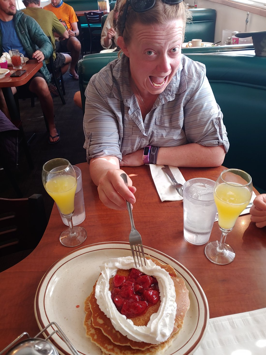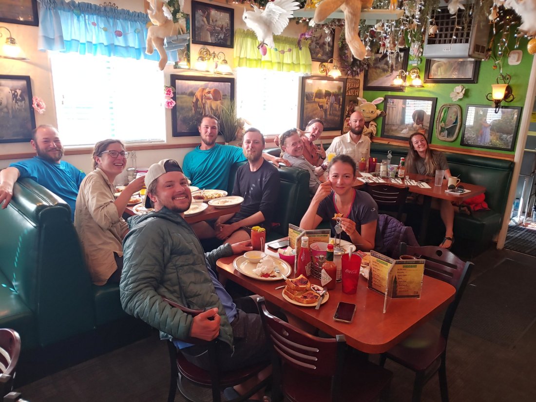We met our trail fam for breakfast at the Evergreen Cafe, where we were psyched to find Columbia! He somehow managed to peel himself from the Hot Springs and pulled some major miles to catch up. We all enjoyed a delicious breakfast, complete with table pancakes!