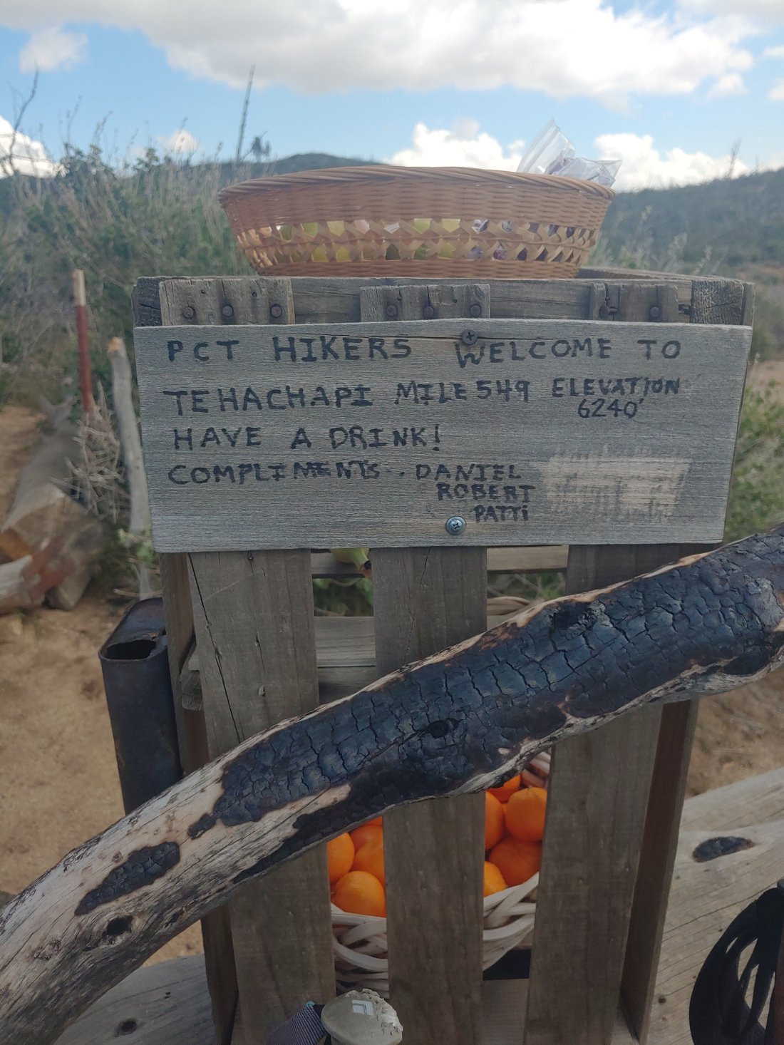 As I neared mile 549 I saw what at first I thought was a mirage- was that a red sun umbrella I saw? Is Matt sitting in a chair?!? Omg yes and yes!!! We happened upon the most beautiful Mojave desert trail magic! Baskets of fresh fruit, water bottles and a water cache, and a cabinet full of cookies!!!!!! AND, SHADE!!! We didn’t need it today (or maybe we did…we all got burned!) BUT holy shit in the dead of summer when people are melting, that shade could be a life saver!!!