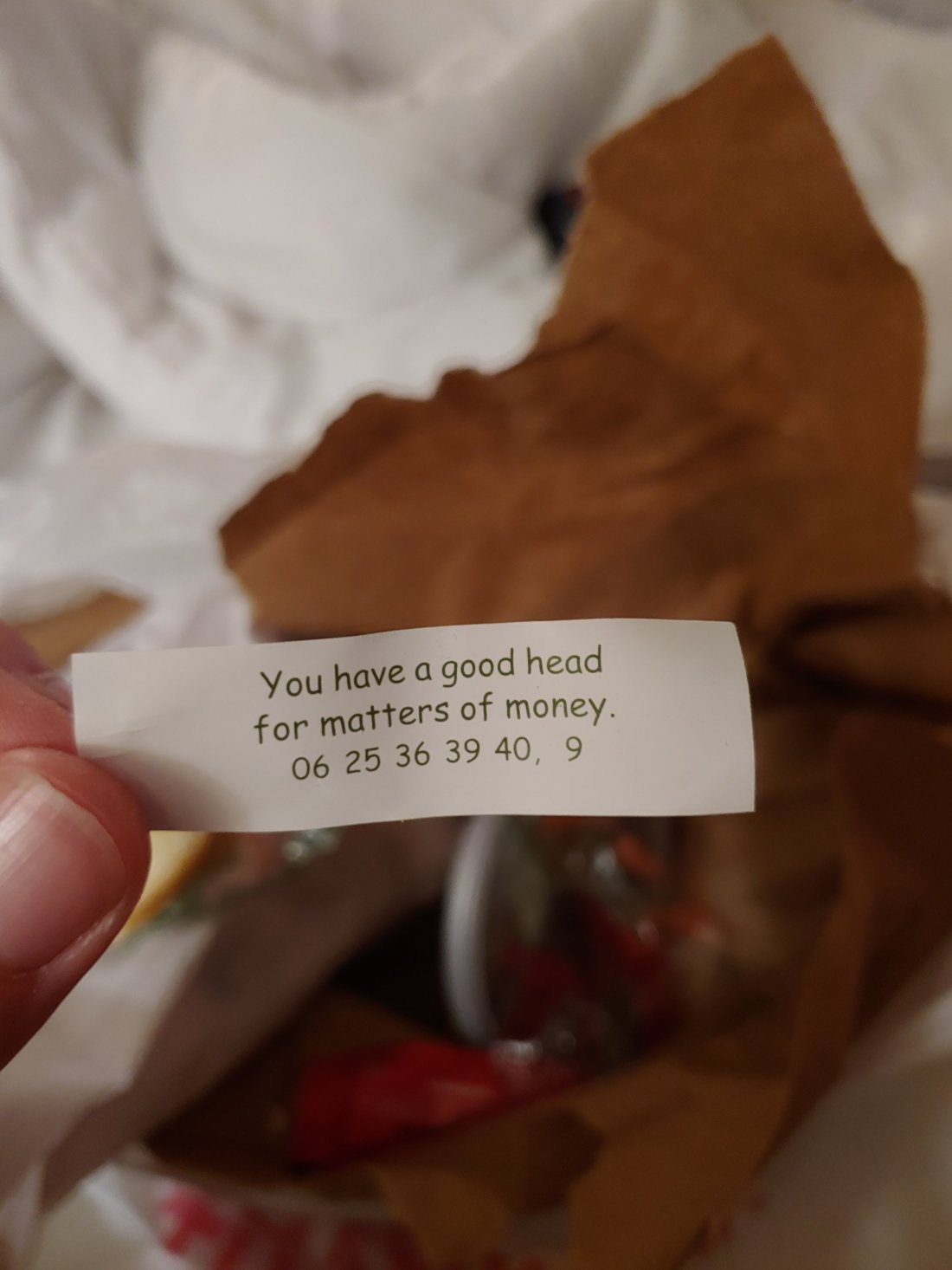 Wednesday we r-e-l-a-x-e-d, only leaving the hotel to buy some groceries down the road and grab Chinese dinner from across the street. On the way back from picking up dinner I was stressing out about all the $$ I was spending on take-out- and look at my fortune! Ha!