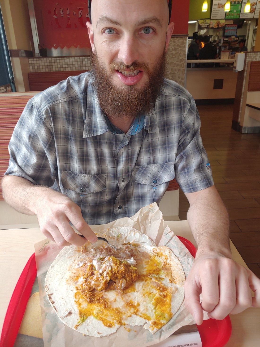And then a little while later he ate a burrito from Del Taco! It was slow-going again (it took him 20 minutes to eat…), but yay! Food!