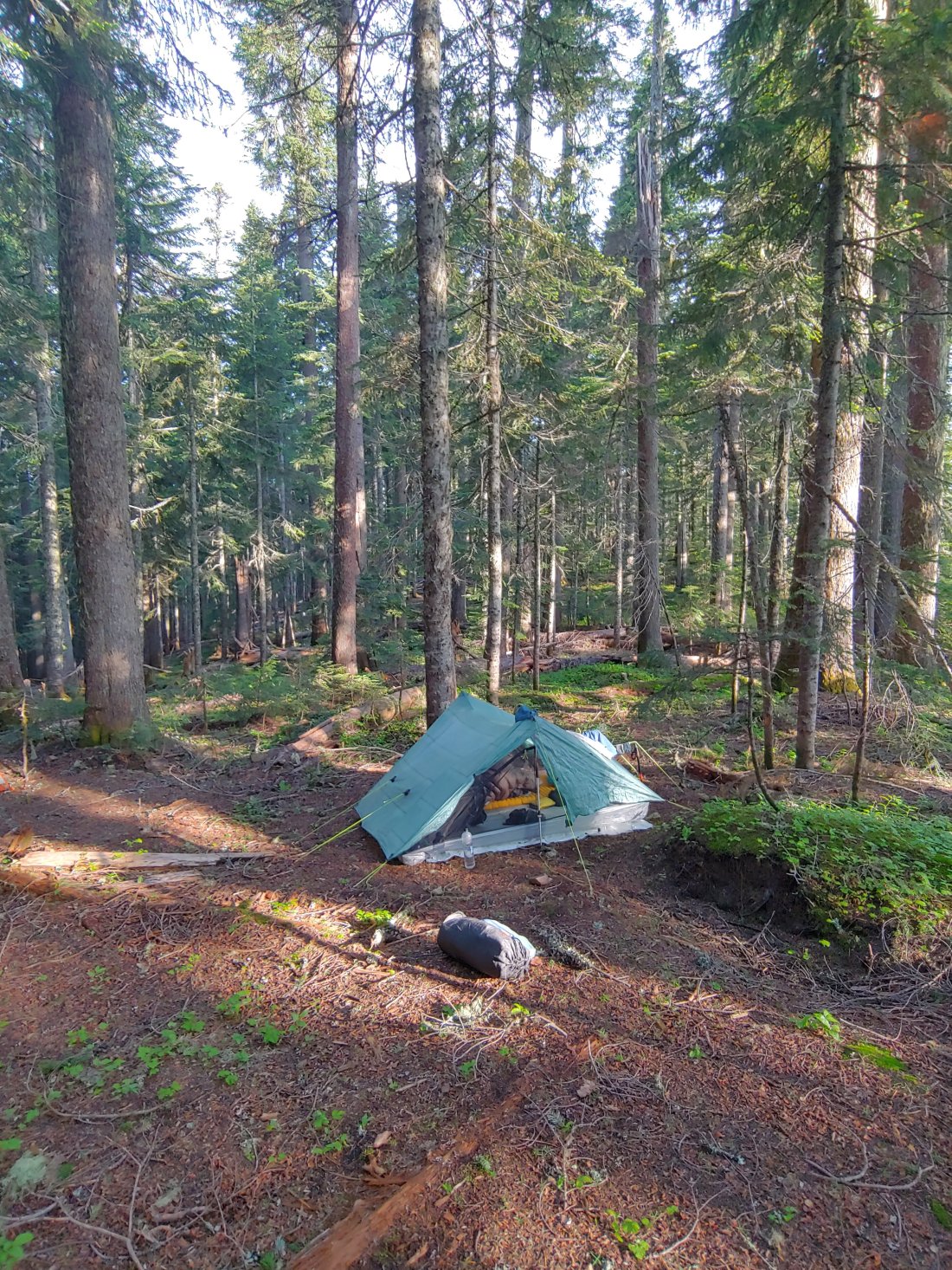 Our new routine: set up tent, throw on our rain gear for bug protection, take out all of our food and scented items and throw in ursack, get our dinner soaking/cooking, set up our sleeping pads and bags, eat, tie our ursacks to a tree, then sleep. We are adjusting to life in bear and feisty-mice territory. (Back in the desert we got in a habit of setting up our tent and sleeping stuff, climbing into bed, and eating out the side of our tent before falling asleep with our food bags between us…)