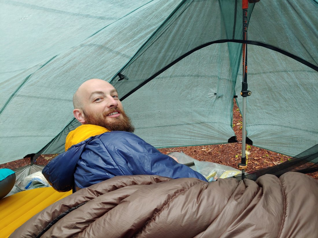The alarms started going off around 6, but as we started to toss in our sleeping bags we heard the rain- to my surprise, Matt suggested we sleep in a bit to wait out the weather!! Yes please!!!!! We slept until just before 9, then Matt ran outside to get our food bags- they were soaked, but thankfully our food was not. We ate breakfast in bed, in no rush to head outside into the wet world.