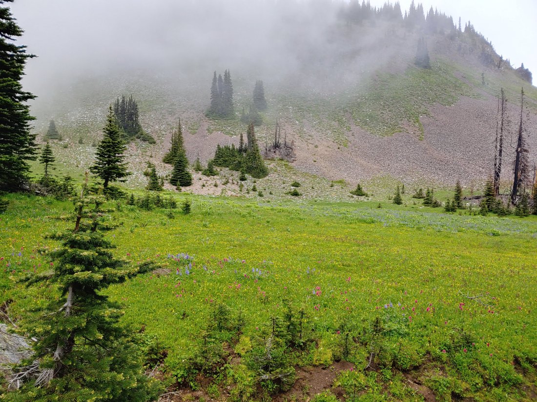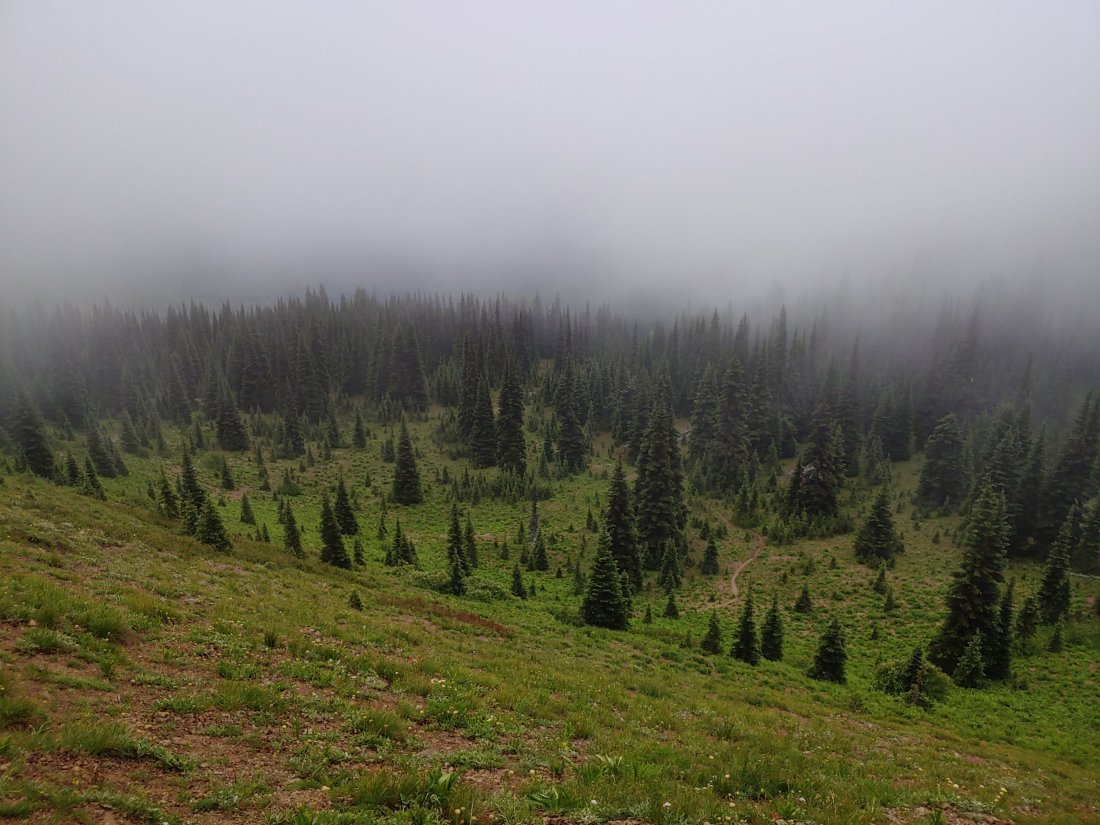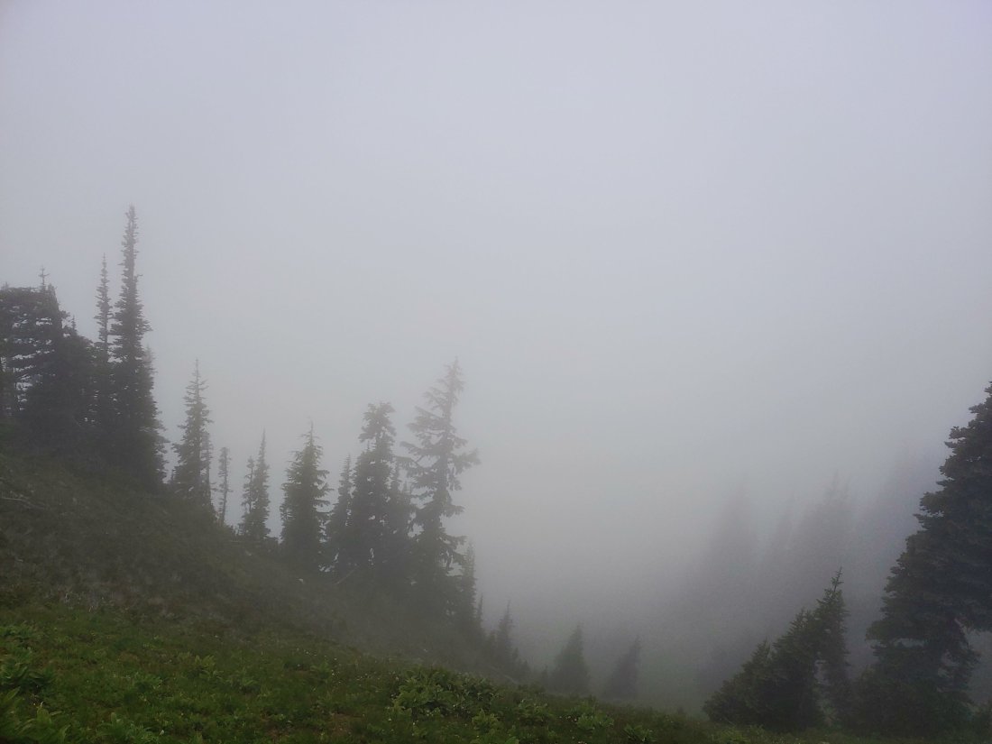 Shotgun passed us around 9, which encouraged us to finally get moving. It was about 1030 when we finally started hiking. While it had stopped raining, it was still misting- we got saturated pretty quickly!