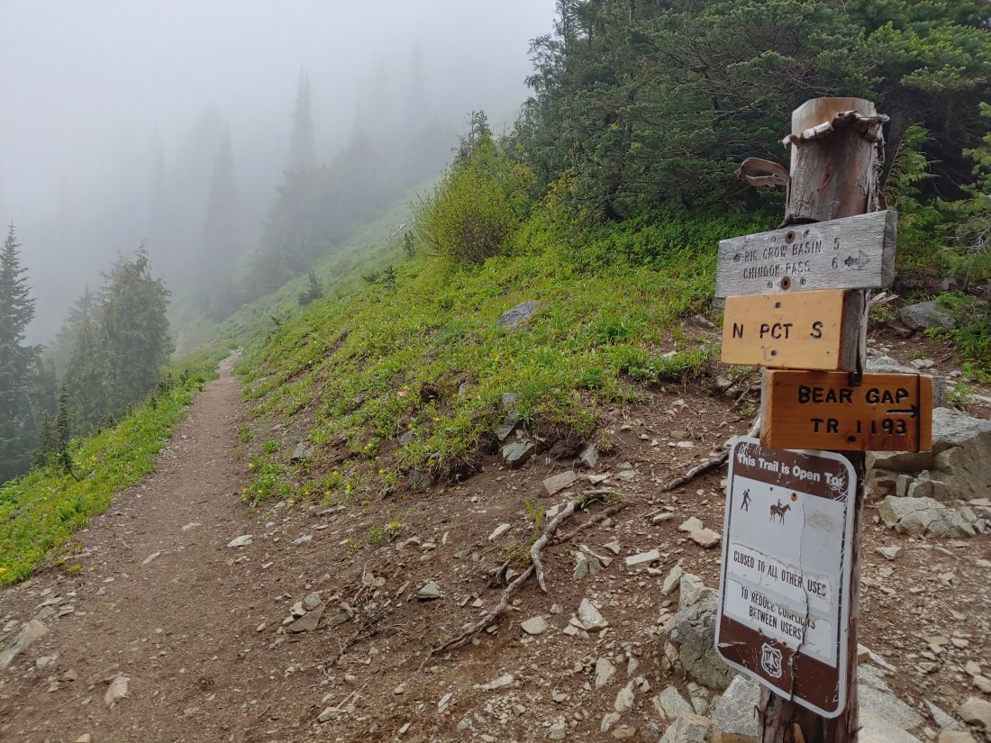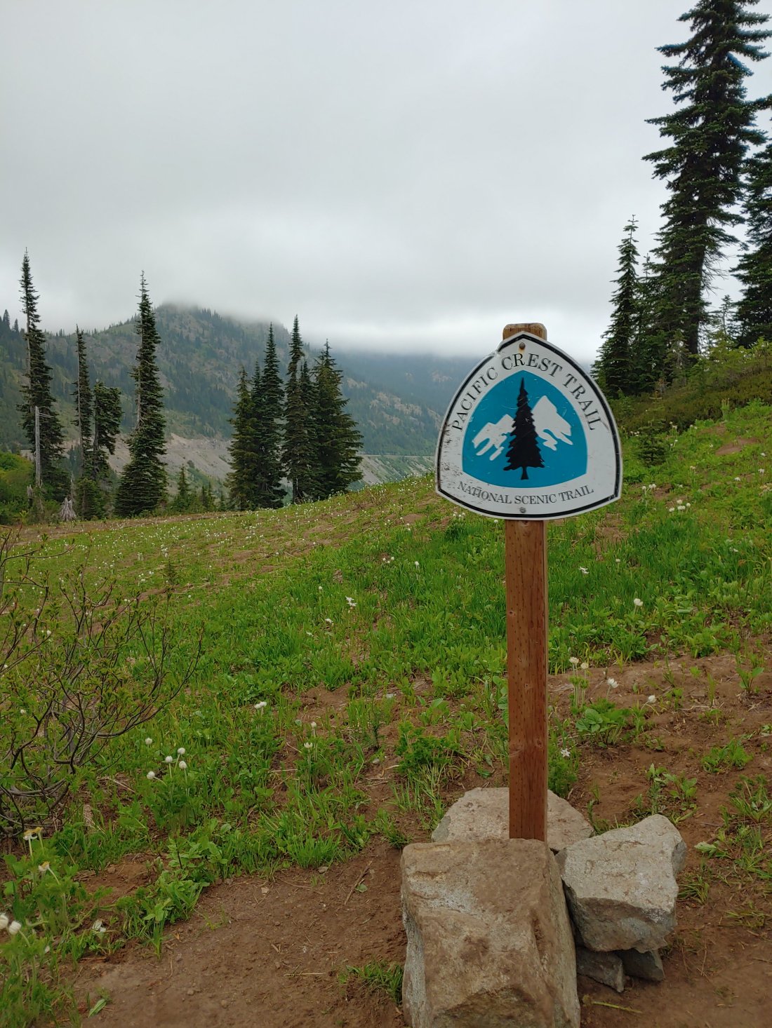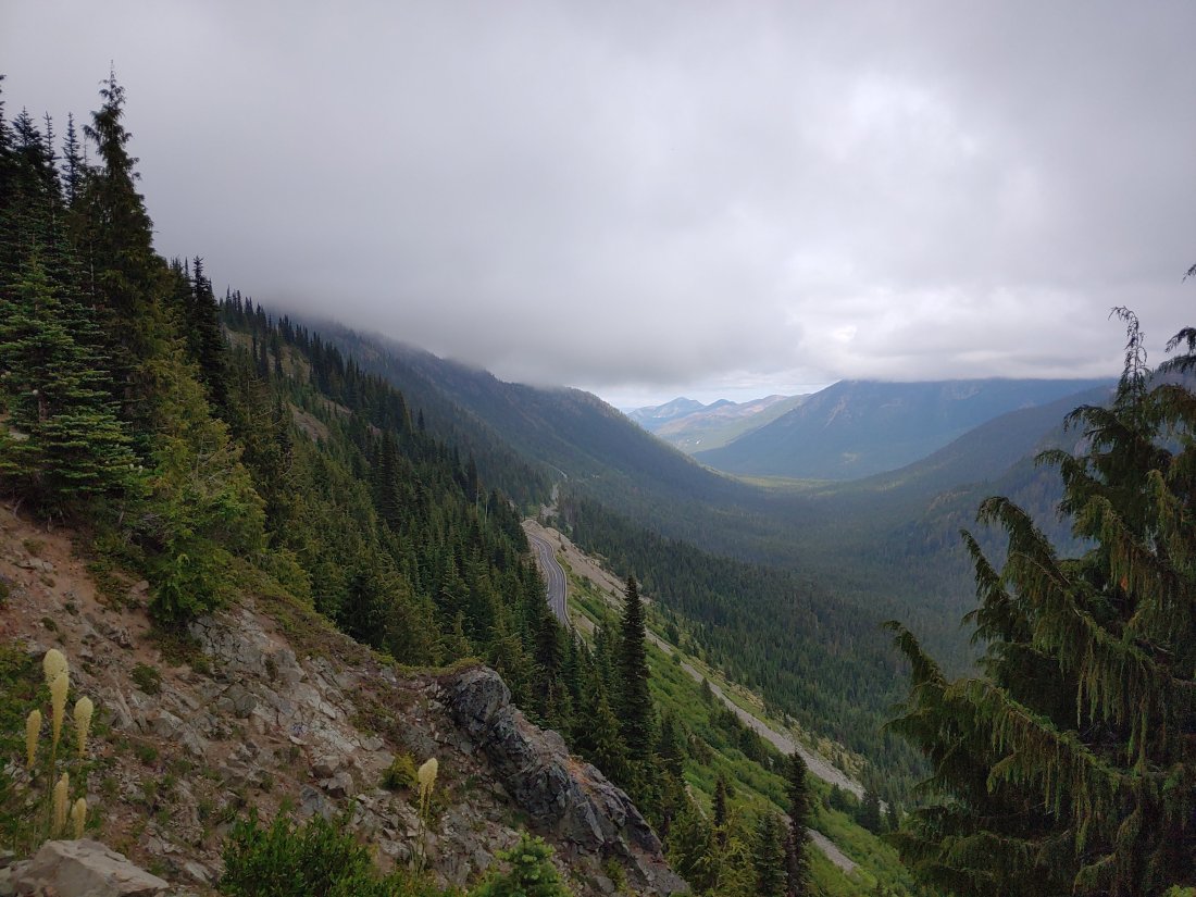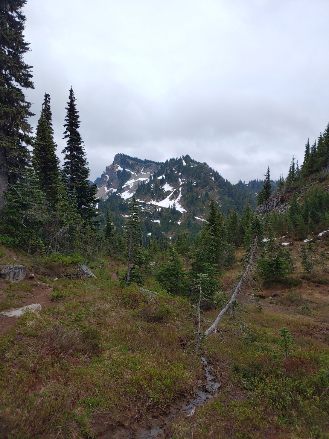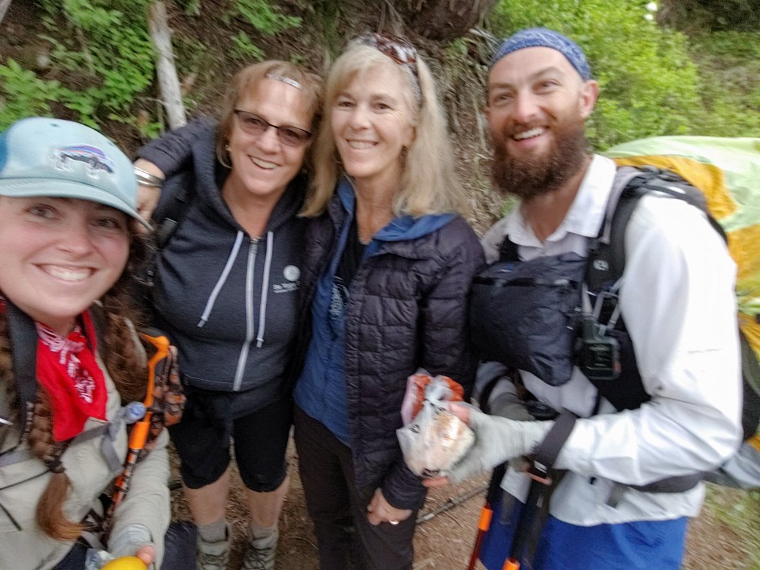 As we climbed up over the ridge and down into Chinook Pass the weather started to improve and we warmed up a bit. Two ladies, Cammy and Cathy, struck up conversation as we passed, and they ended up offering us fresh BLT sandwiches and fruit! (We ate them later, but OMG those were the BEST damn lettuce and tomato sandwiches ever!)