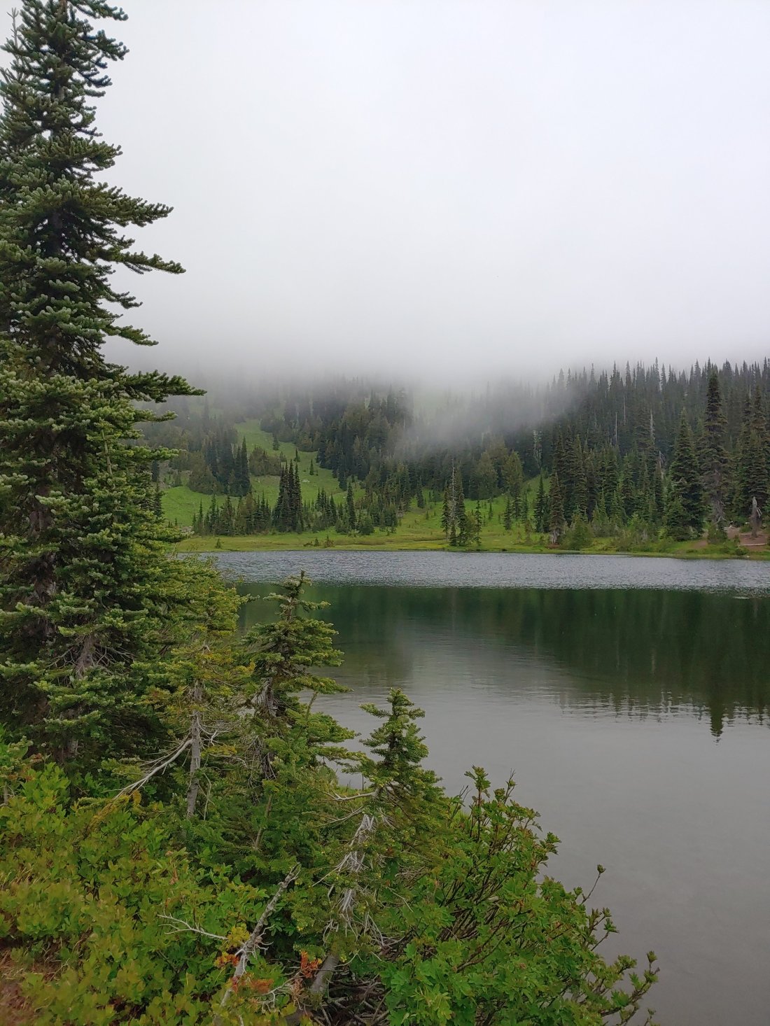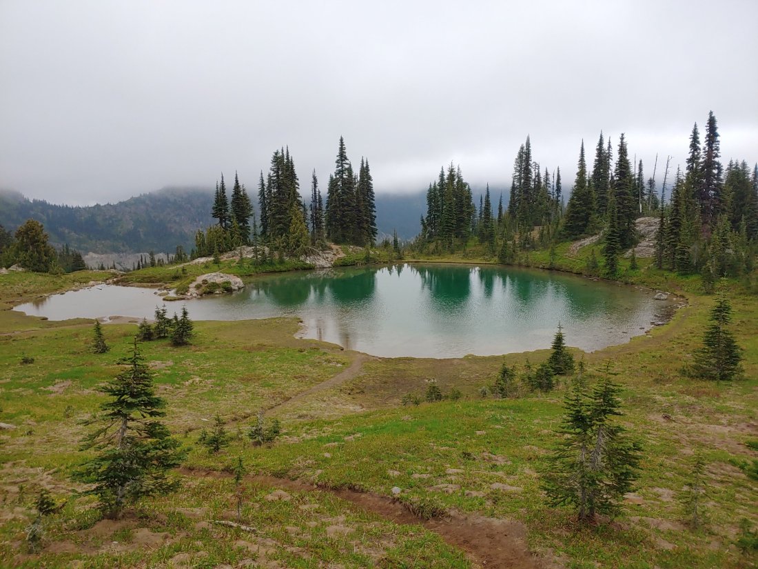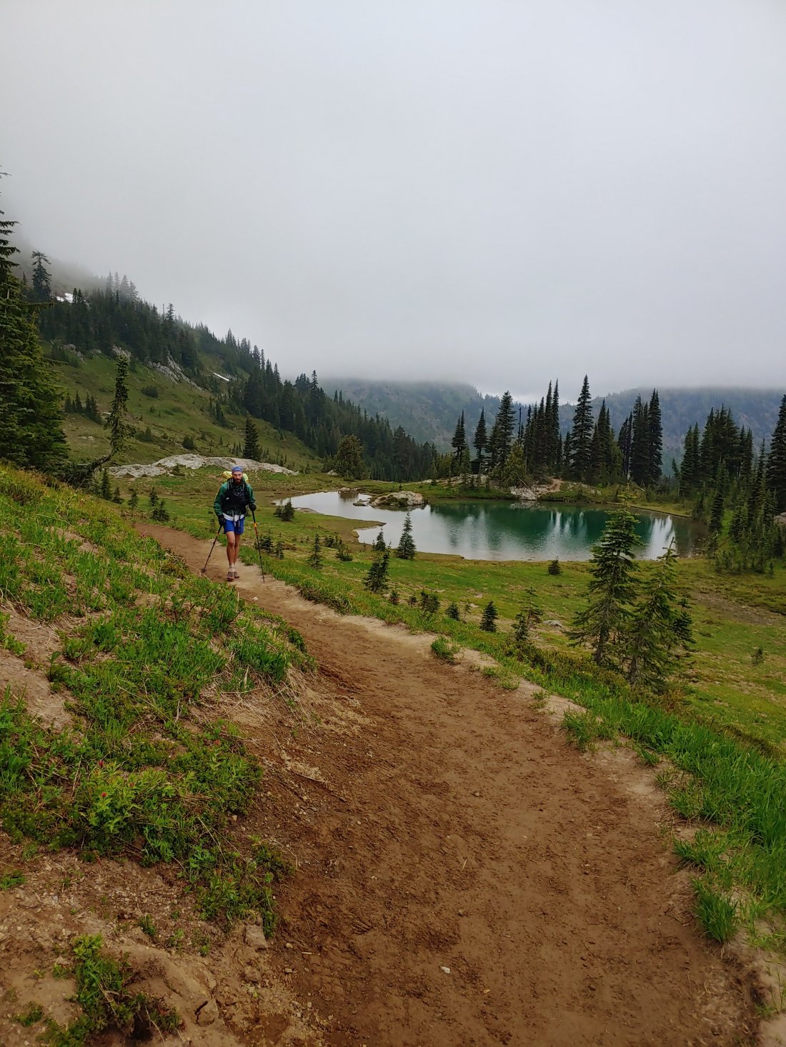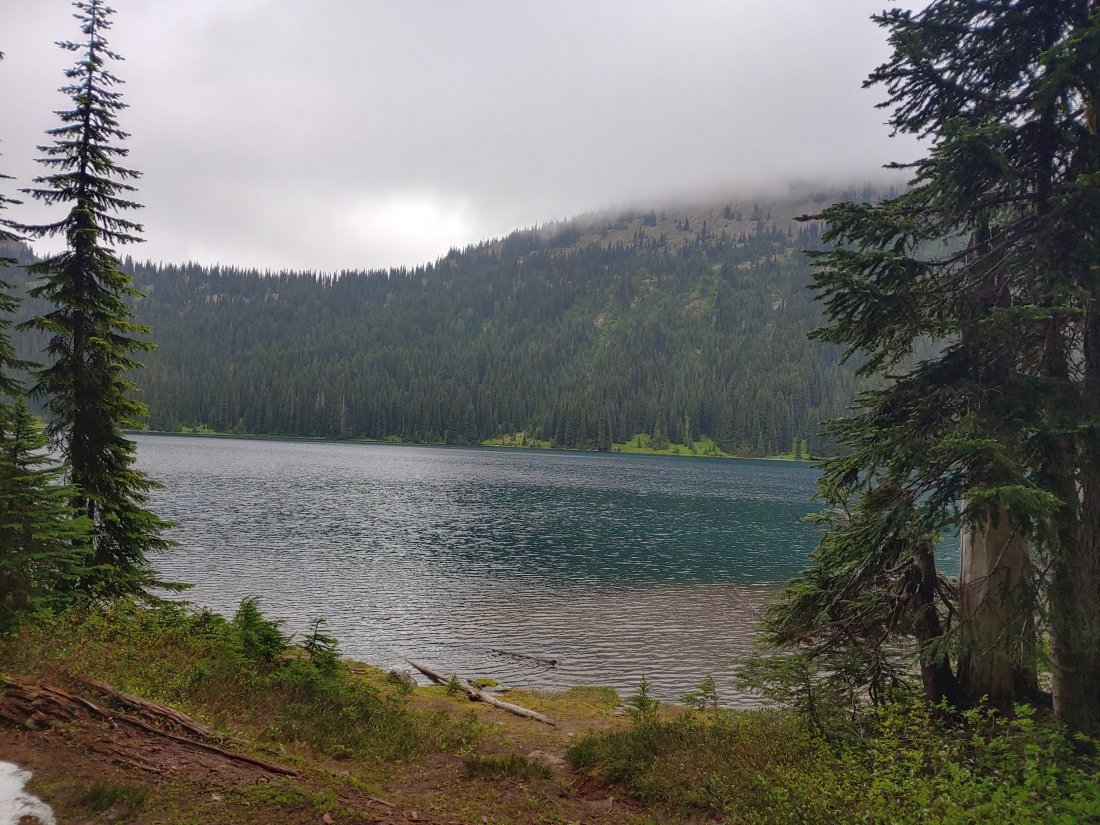 As we sat there enjoying our first real break of the day, it started to get wet and uncomfortably cold again, so I suggested to Matt that we only hike another 3 miles to tent-sites at Dewey Lake. It was around 5:15 as we donned our rain coats and gloves in preparation for the wet and chilly climb out of Chinook Pass.