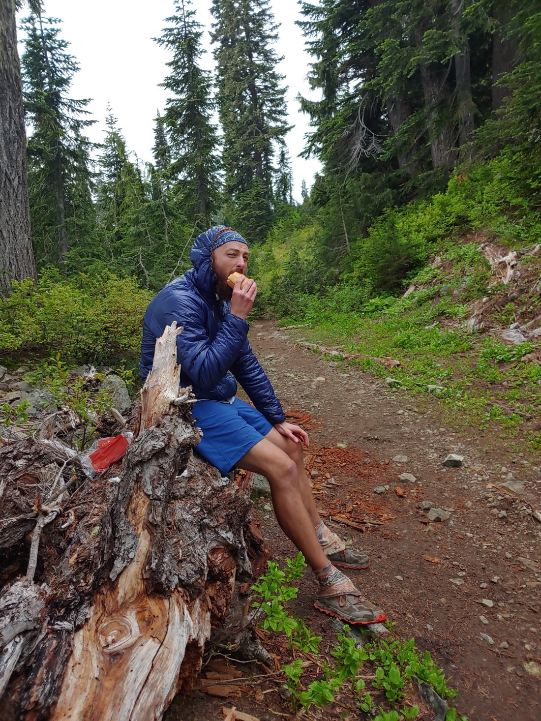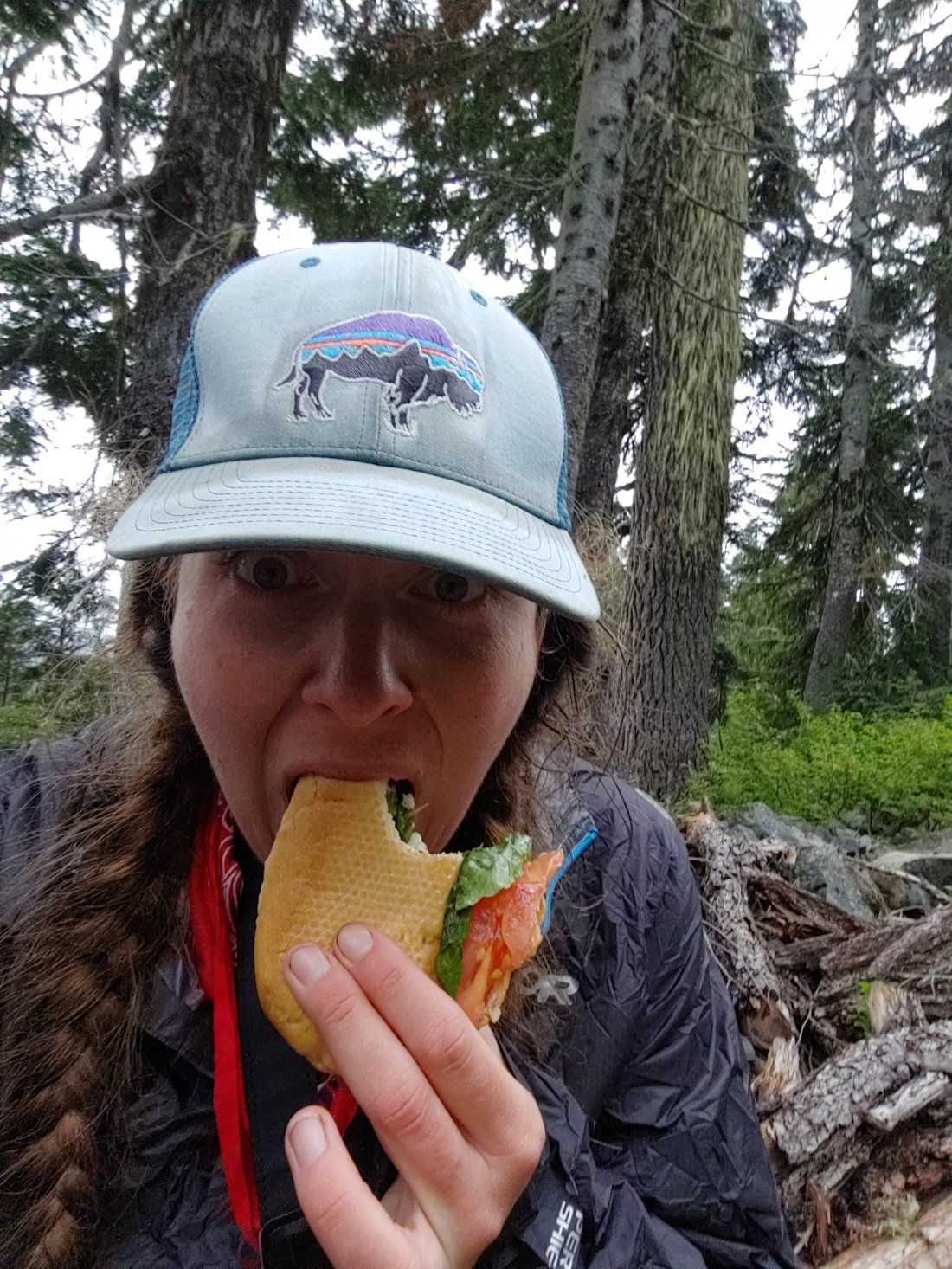 We eventually made it down to Chinook Pass, which is the east entrance to Rainier National Park and a total hot spot for locals and tourists looking for day hikes and overnights. The parking lot was packed! We sat just above the parking lot (and out of public view) to completely stuff our faces.