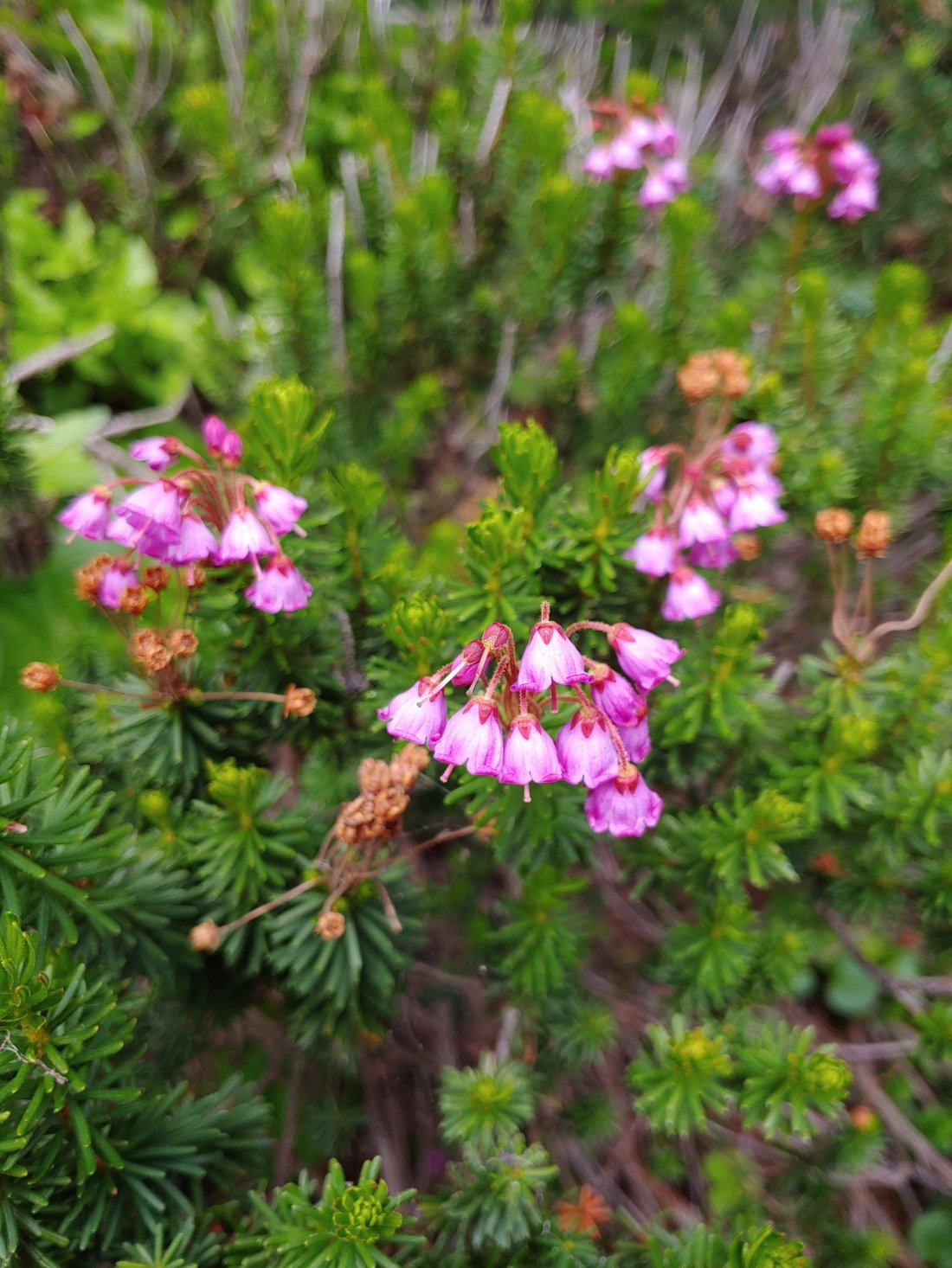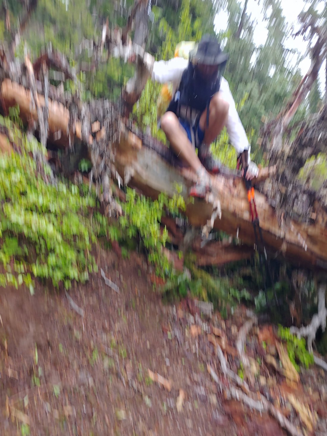 Not long after we came across a big-ass tree blocking the trail- it was one of the bigger trees we have had to climb over and it took a minute to figure out the best method. Shortly after, the trail turned up above the main tree line- we were exposed, and it was wet, windy, and cold.
