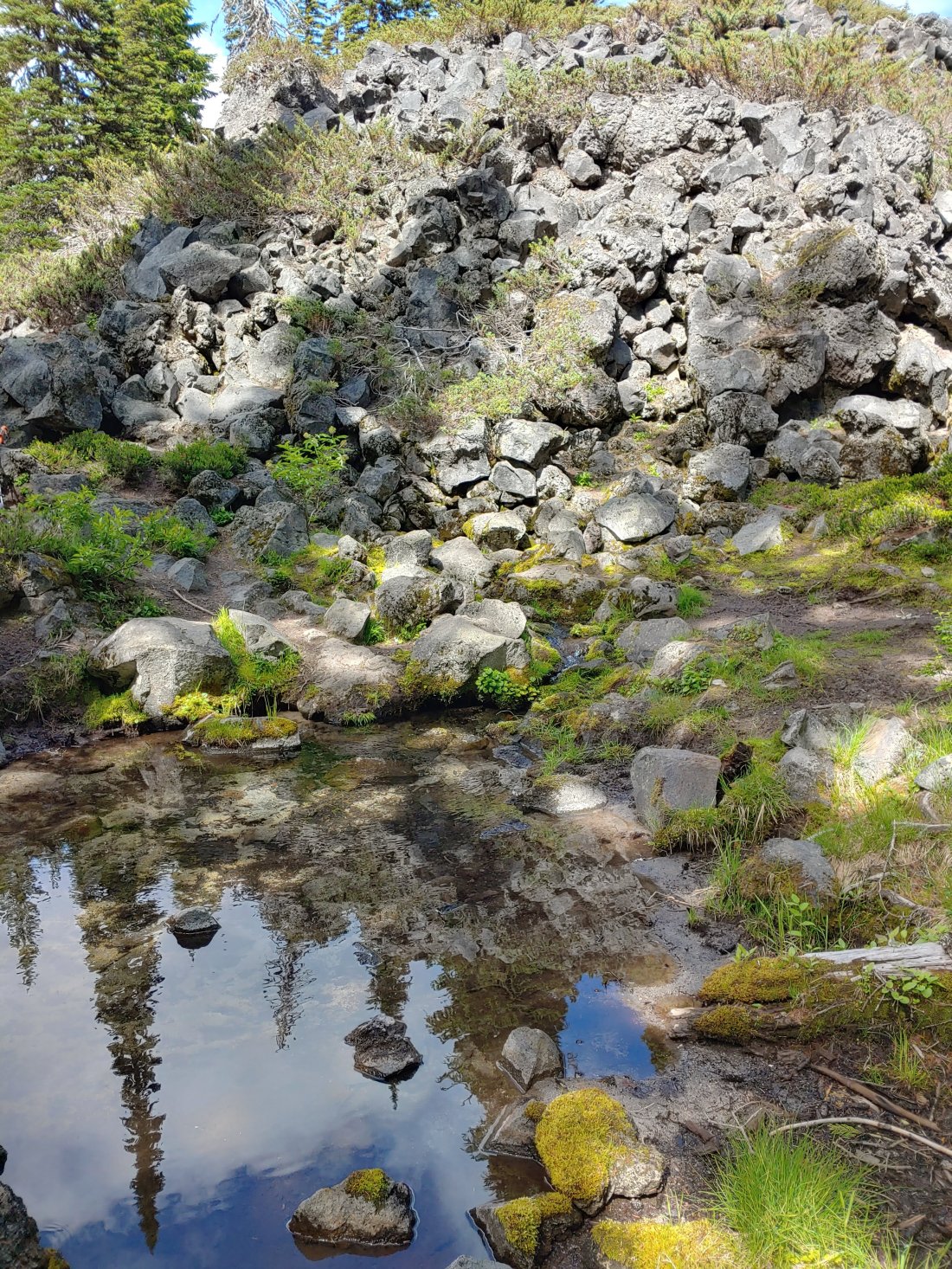 After lunch, as we began walking again, I started to feel like shit. I think I was dehydrated and overheated in my rain pants, but I was stubborn and didn’t want to stop to take them off until right before our next climb. After 3 miles we stopped at the Lava Spring, (a spring that flows out of lava fields, go figure!) where I took a short break, ripped off my pants, and prepped for our 1,600 foot climb (over 9 miles! Such a nice, gradual climb!! Yesterday we did 1400 feet over 2.5 miles.) I definitely felt better after my water break!
