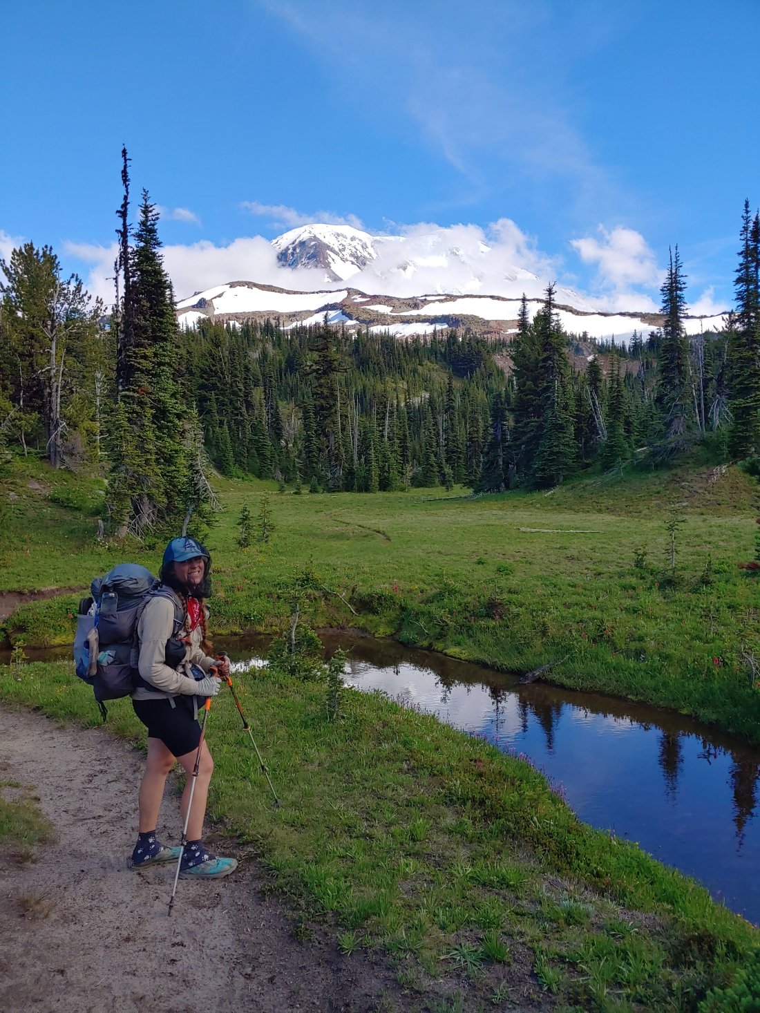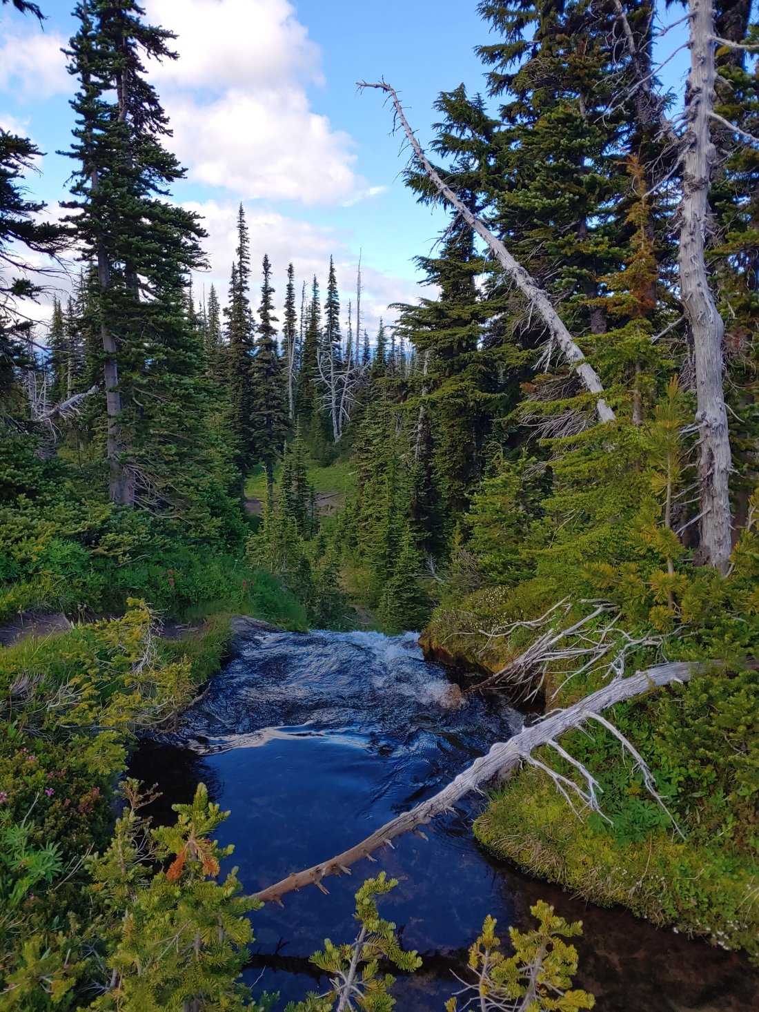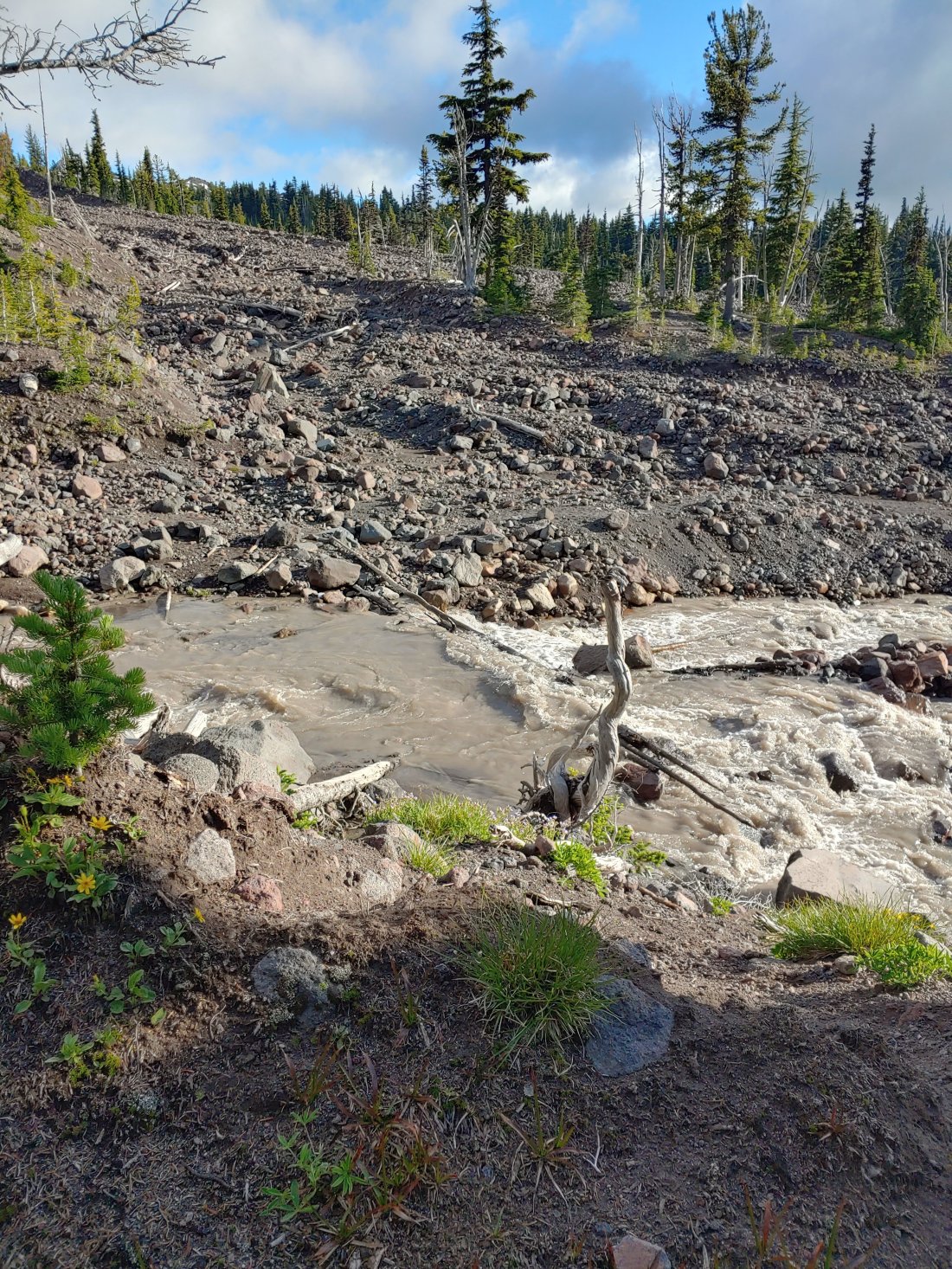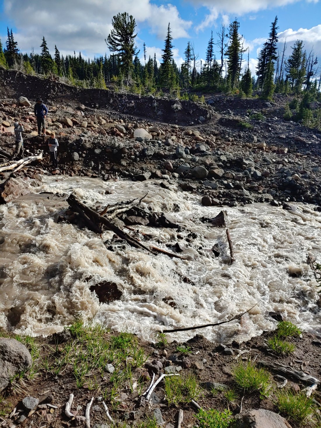 Although slowed down by my constant photos of Mt. Adams, we eventually made it to the dreaded creek- andddddd, it was gushing…like, unsafe to cross gushing. I asked Matt, a white-water kayaker, which class those rapids might be classified as- he estimated class 3…out of 5. Fuck.