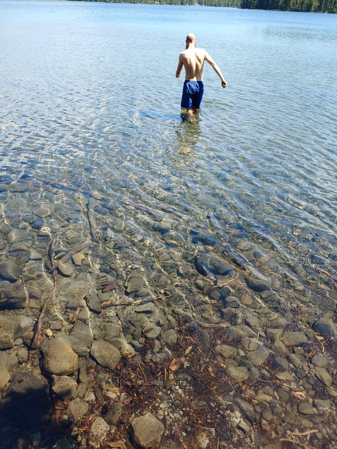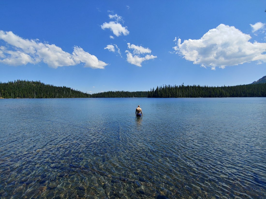 Since there is a parking lot and trailhead nearby, many locals come for the day or for a few days and set up some amazing camps with hammocks and tents- I felt like I was on a deserted island & could have stayed for days! Matt took a little dip in the lake while I took a little siesta. Would you believe we let 2 hours slip by again? There goes our 30 mile day…