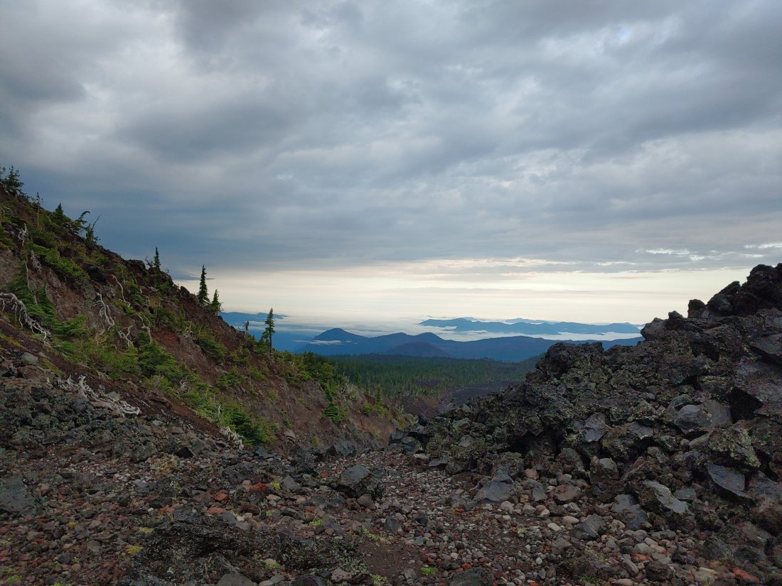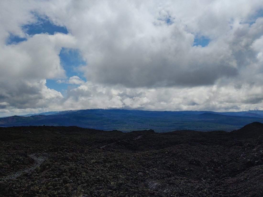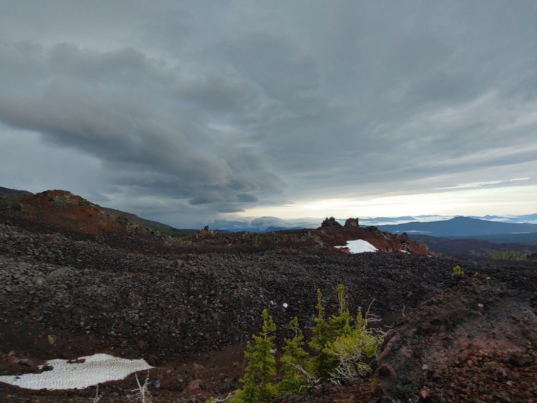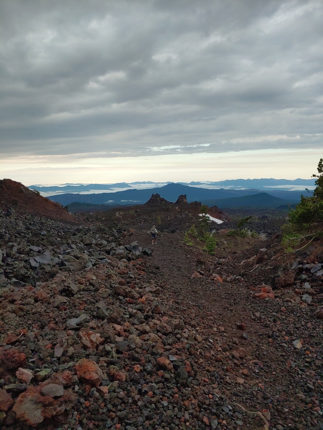 It was pretty wild- one second we were in this green, thriving forest, and the next we were in a dry, barren lava field with no signs of life. As we left the trees Matt turned to admire the drastic contrast, and then he saw the clouds- the dark, scary, end of the world, dementor clouds- I was a few steps behind and he called to me, “Look,” pointing at the sky, “we gotta get moving.” And so we did- we hightailed it up the 2.2 mile, 900foot rocky climb, while I repeated a prayer, “please don’t storm until we get up and over, please don’t storm until we get up and over.” – and it didn’t. And I didn’t even notice if the rocks were rough on the feet ’cause I was so preoccupied!