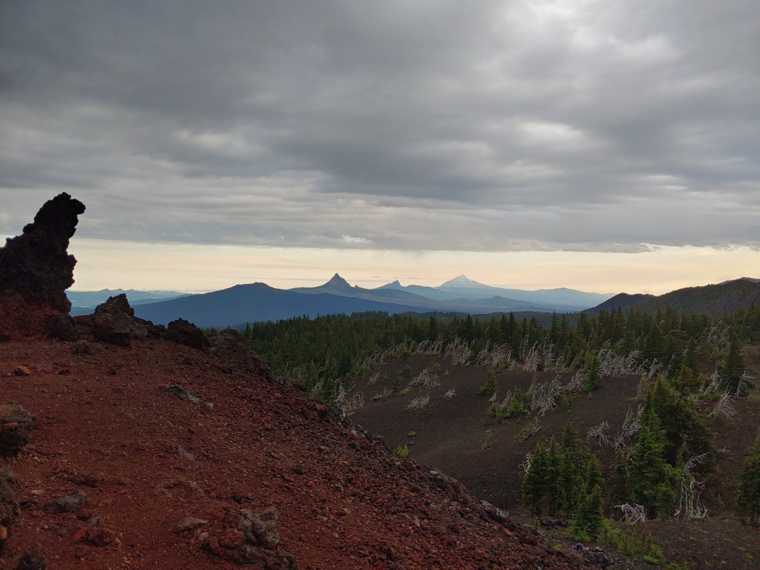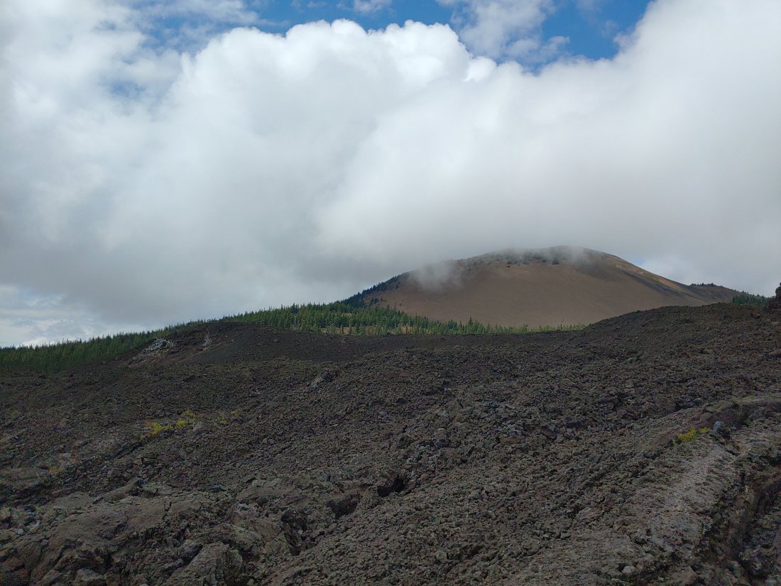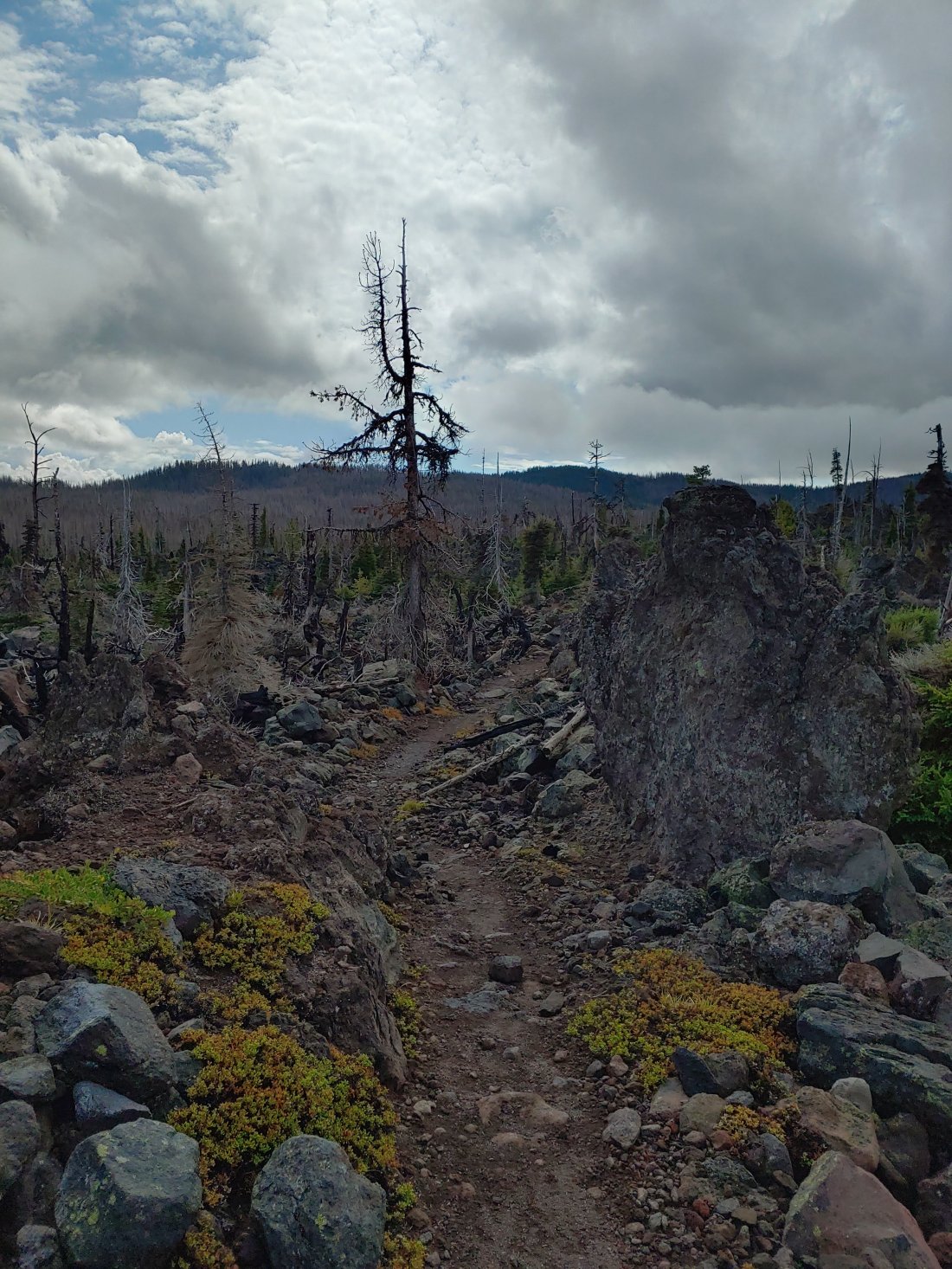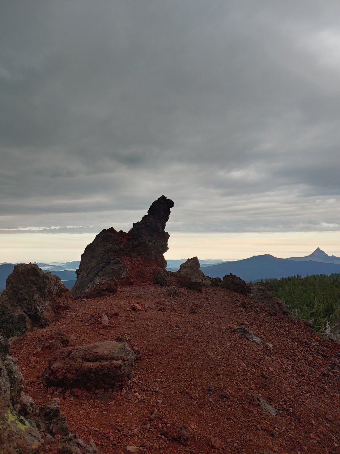 It was pretty wild- one second we were in this green, thriving forest, and the next we were in a dry, barren lava field with no signs of life. As we left the trees Matt turned to admire the drastic contrast, and then he saw the clouds- the dark, scary, end of the world, dementor clouds- I was a few steps behind and he called to me, “Look,” pointing at the sky, “we gotta get moving.” And so we did- we hightailed it up the 2.2 mile, 900foot rocky climb, while I repeated a prayer, “please don’t storm until we get up and over, please don’t storm until we get up and over.” – and it didn’t. And I didn’t even notice if the rocks were rough on the feet ’cause I was so preoccupied!