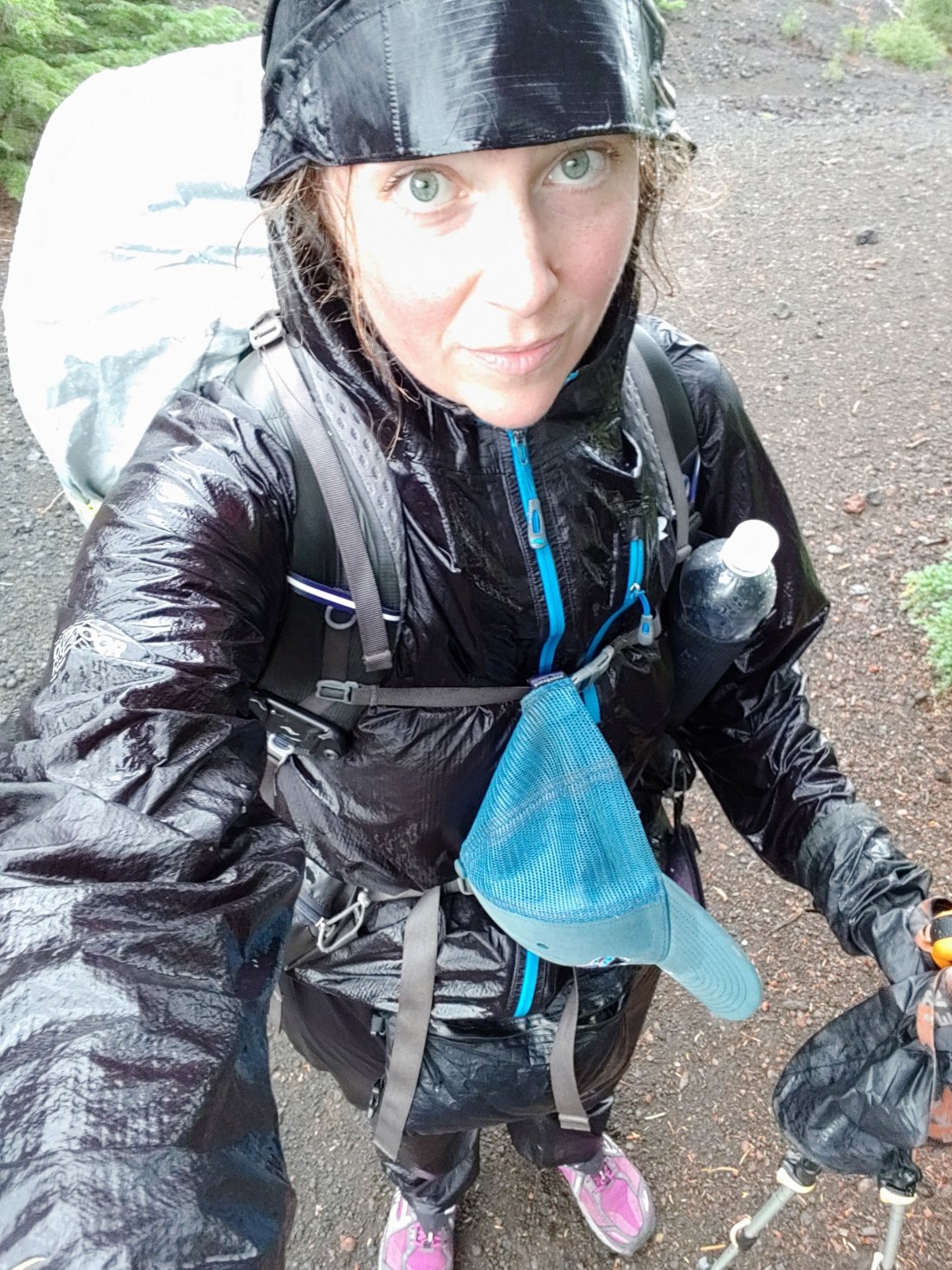 Just as we made it over the climb and into the trees it started to rain. We covered our packs & put on our full rain-gear just in time. I was again dripping wet and had to go to the bathroom, but that definitely wasn’t gonna happen in the downpour! Uf!