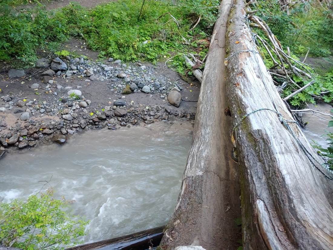 You can’t tell in the photo due to the angle that I took the picture, but the logs were pretty high up and the top log overhung the bottom one, so we were forced to bend forward to maneuver our bodies along the top log while shuffling our feet along the bottom log that we couldn’t always see. A rope had been tied to the logs to give us something to hold onto- but who tied it and was it safe?