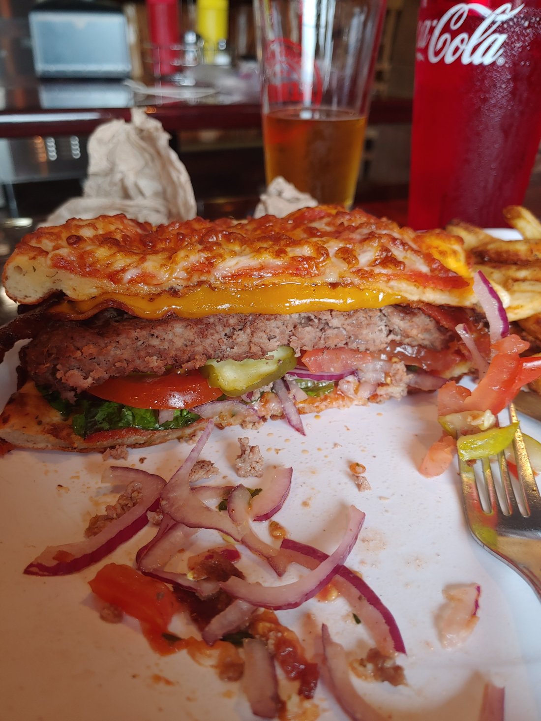 By the time I was done, we got word from Fairie Feet & Fraggles that they were back in town after running an errand, so we met up with them at the Cascade Locks Alehouse. There Matt killed the Hiker Trash Burger, a burger with a 12oz patty, bacon, cheese, and two pepporoni pizzas as the buns- I was so proud of him!! 🙂