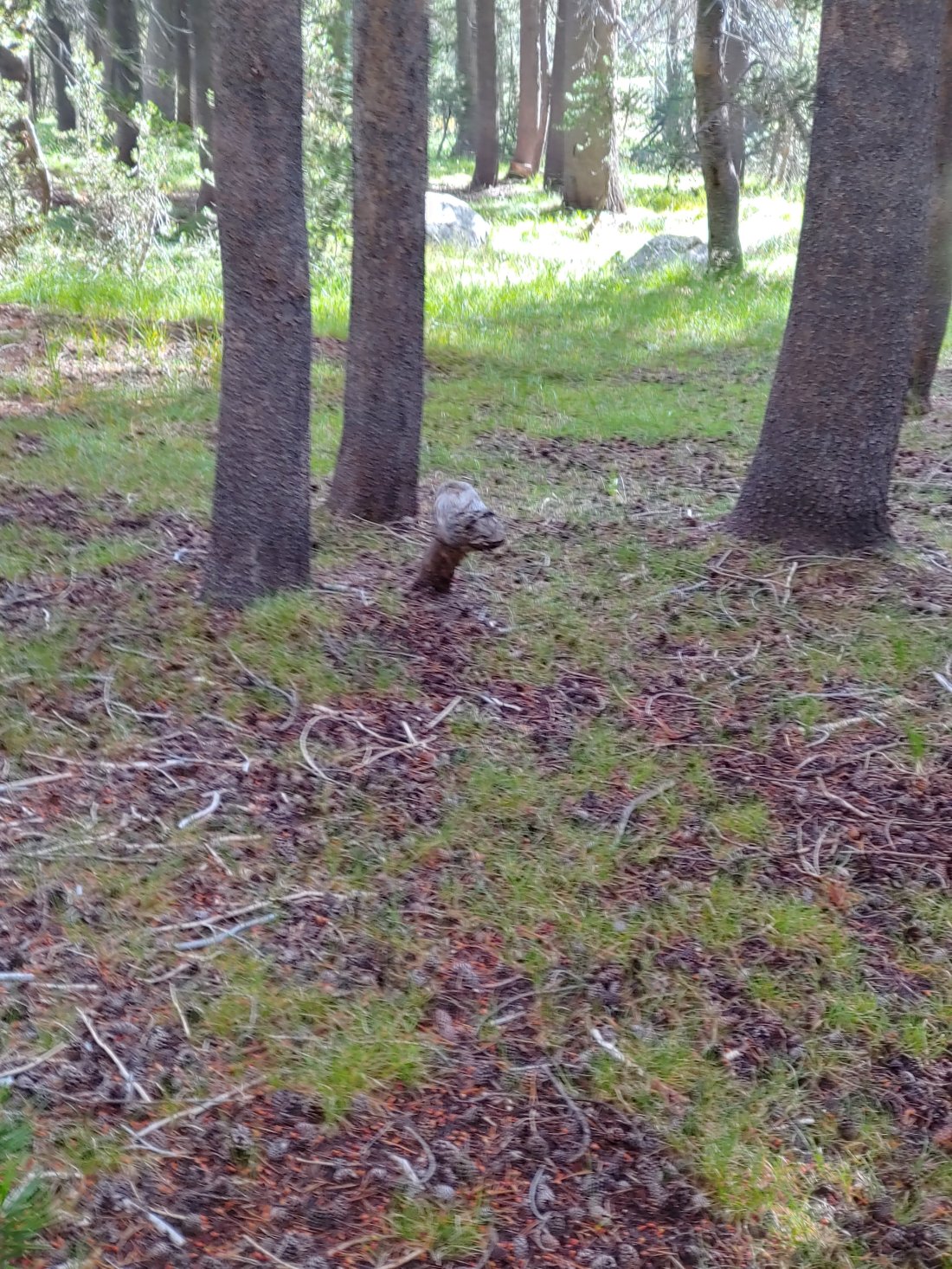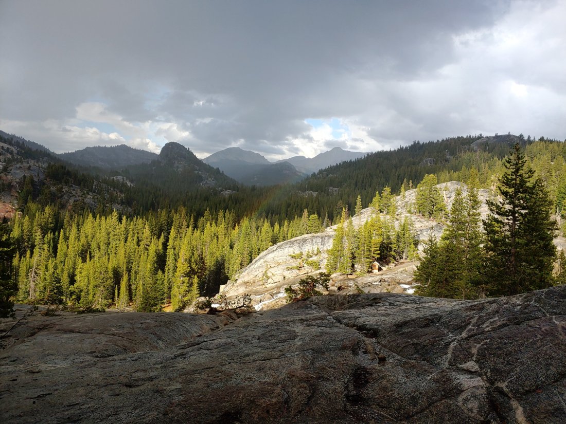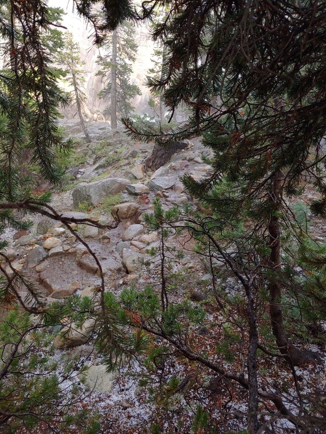 As the storm subsided we continued up the trail, but the respite from the rain was brief. Another storm came barreling through, forcing Matthew and I to find another set of trees to seek shelter under. When this storm ended, Matt and I again tried to hit the trail, but…what trail? We were so disoriented! Before running into the trees we had been hiking over these big granite rocks, where the trail is usually outlined by a trail of smaller rocks or marked by cairns, eventually leading to a dirt path with footsteps, but all footsteps were washed away and the only rocks “leading the way” lead us in the wrong direction…mother focker!!