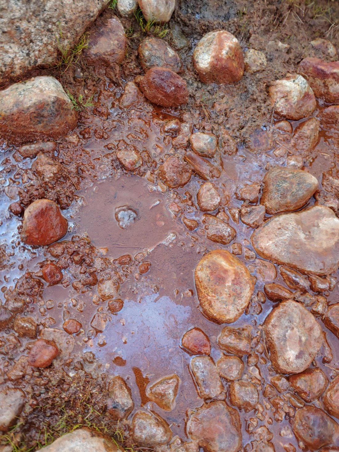 With just under 6 miles to go, just as we came to the start of another climb, the heavens let loose- rain, hail, thunder- the works! We hid under a tree that offered some protection from the chilling rain and painful hail, but we soon had to relocate as the trail became a total mudslide and drained into our path. We found another set of trees, free from the path of a mudslide, to wait out the remainder of the storm.