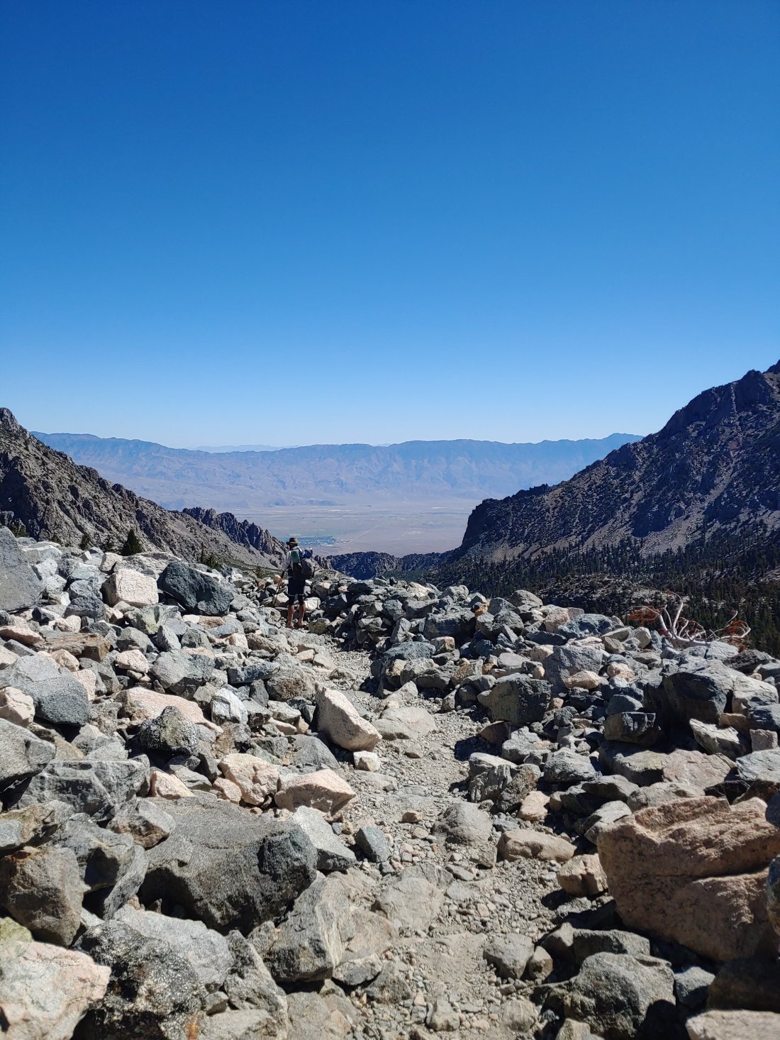 Matt beat me to the top, and when I arrived I found him chatting with a group of JMT hikers. When Matt introduced himself, the group got excited- “you’re Jaws?! We heard about you!!” somebody exclaimed. Guys, Matt’s famous!! As it turned out, the group had camped with Kenny and Chuckwalla the night before and somehow our names had come up. We shared tales of trail names and trail trials before starting our journey down from Kearsarge Pass to the Onion Valley Trailhead, where we had hoped to catch a ride to town.