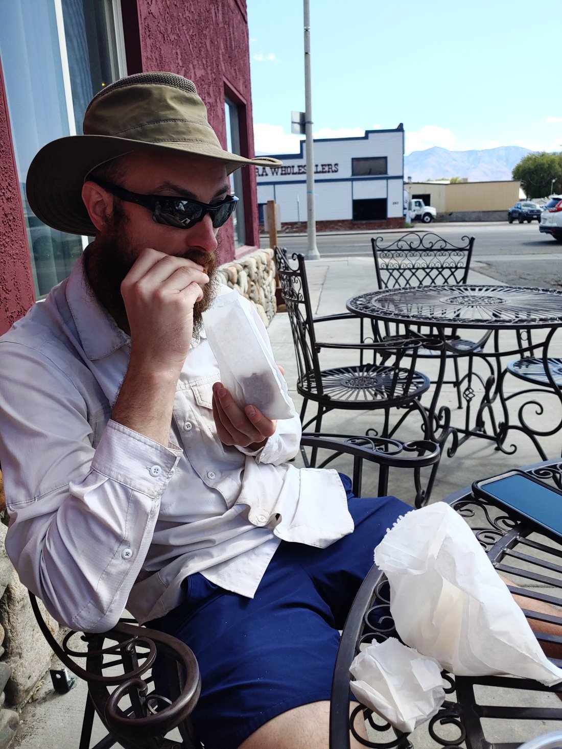 • Matthew’s Birthday Dinner at Sage! Possibly the highlight of our day, we dined at this too nice for thru-hikers restaurant in an area of Bishop we had never explored before. We had about 284 courses of yummy food, including 2 bread baskets, a shared appetizer, soup, salad, dinner, & dessert…nomnomnom. While we were dining, we saw two other underdressed thru-hikers stumble in looking for some tasty grub- because I’m me, I initiated convo, and within minutes I thought we were experiencing some sort of glitch in the matrix- I literally turned to Matt and asked, “are they us?!!?”