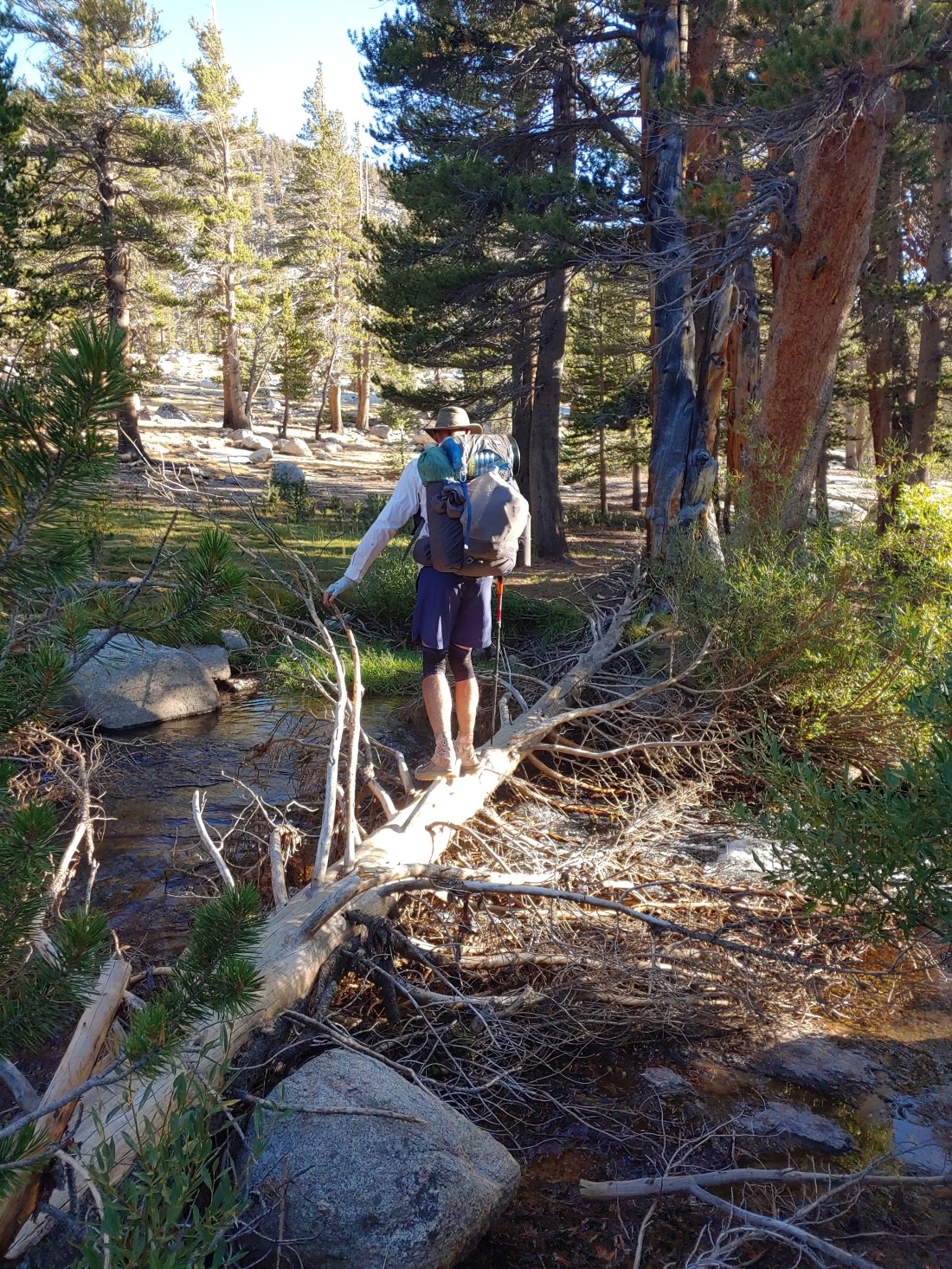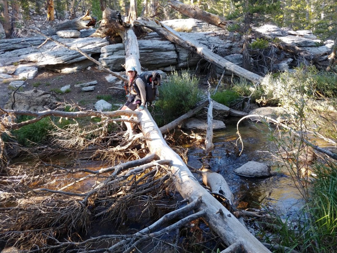 Just before starting that last climb, we came to Whitney Creek. There we found what seemed to be a somewhat sketchy rock hop across (some of the rocks were wet and a few were totally submerged in water), so we decided to try and find another route. We found a decent looking log and Matt crossed first, slowly but surely. I followed, but about half way across I freaked out. What the hellllll?!?? I LOVE log crossings!!! I usually sashay across them quickly and confidently- what was going on?!? (It probably didn’t help that moments before stepping on the log I tripped on literally nothing and almost face planted hardcore…)