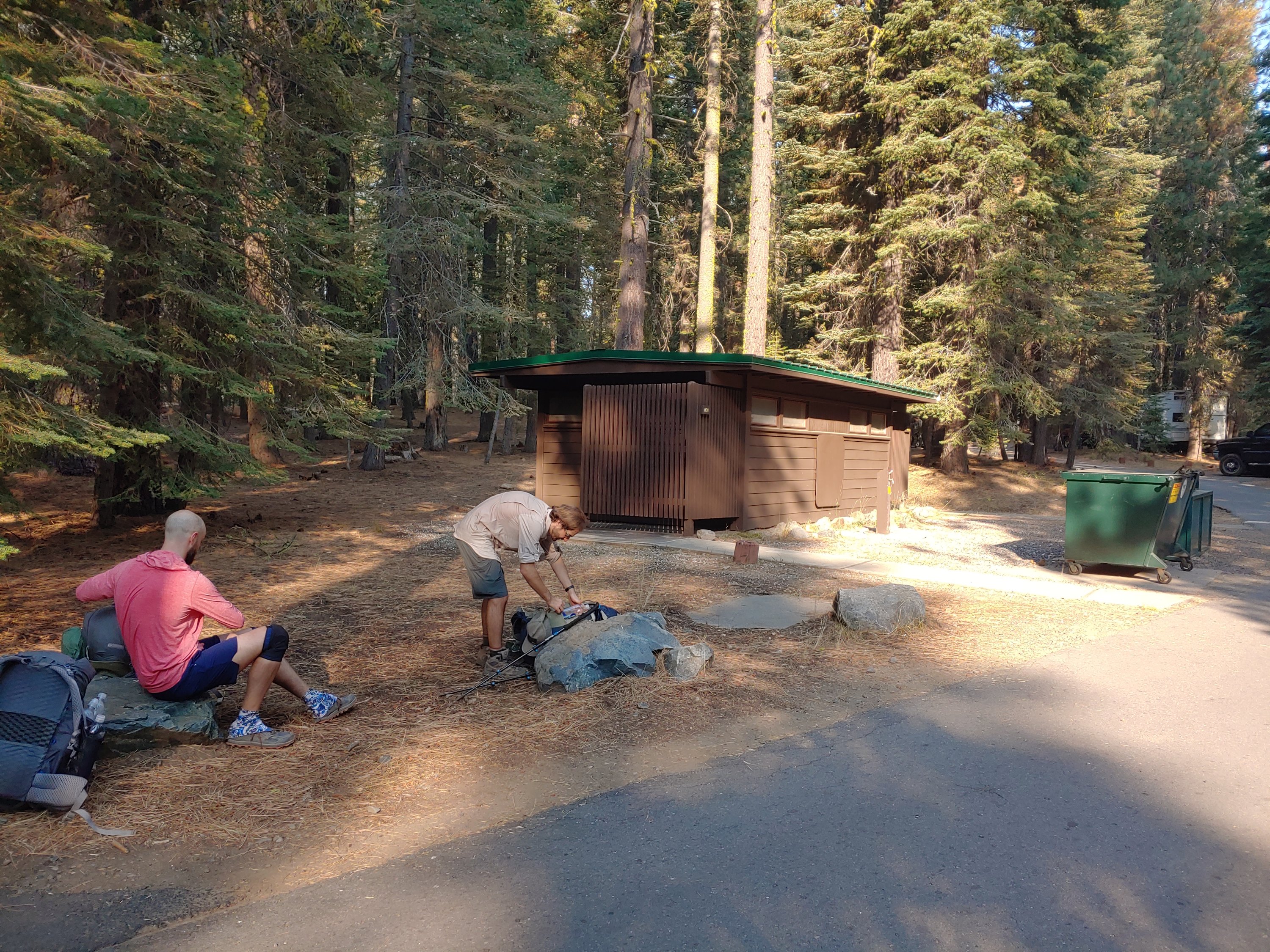By 0915 we were at the campground, having kept about a 23min/mile pace. We quickly navigated our way over to the prime break spot, where we had immediate access to rock seats, flush toilets, a water spigot, AND a dumpster! We dropped our packs and started on second breakfast.