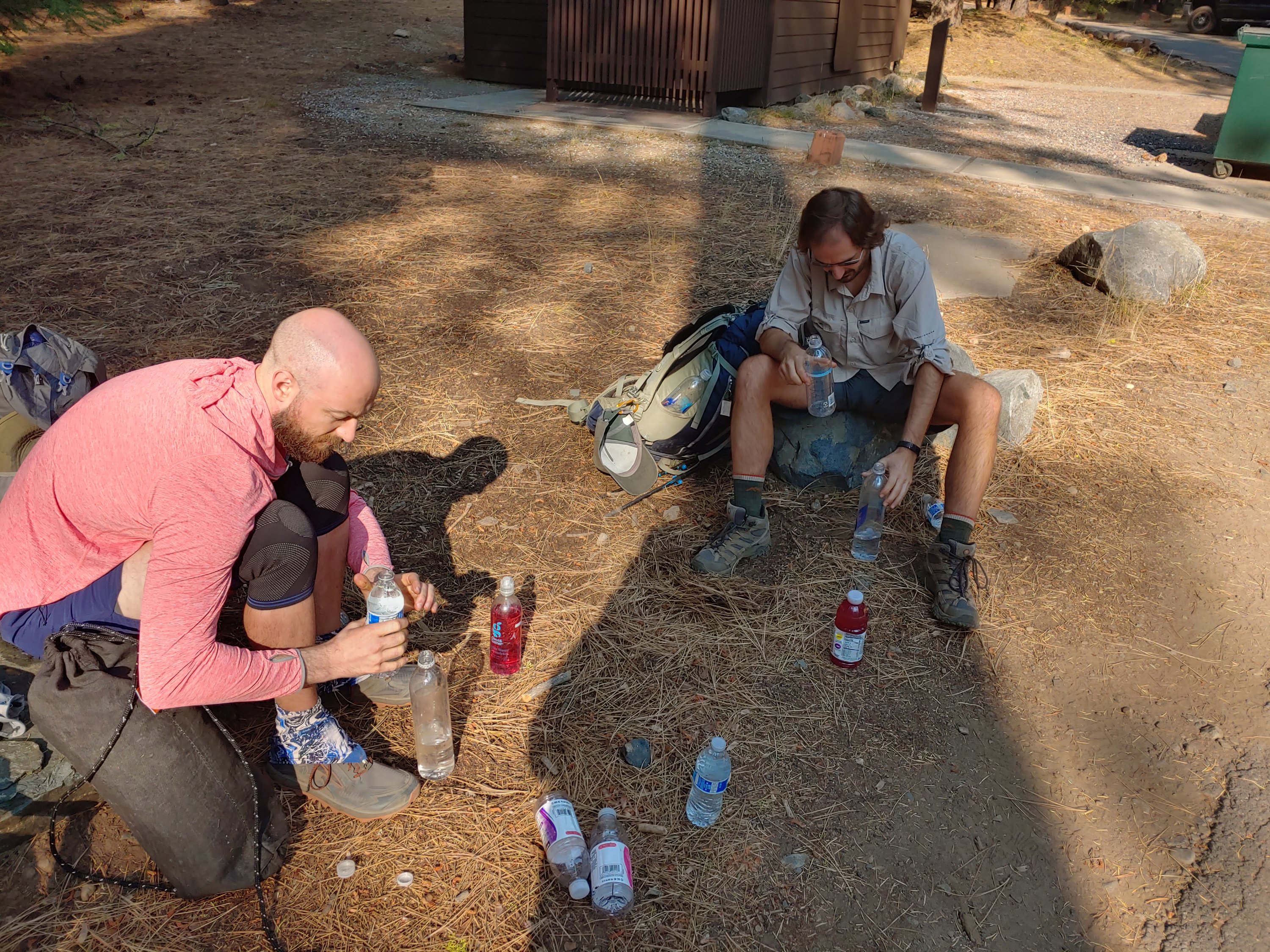 Jesse and I each took a few bottles of water and returned to Matt to begin our prep to return to the trail. As we were packing up, Dennis drove by and wished us luck and encouraged us to take more drinks if we wanted. Matt and I ended up walking back to Dennis’s site- Matt for a soda, me to write a thank you note on a paper towel.