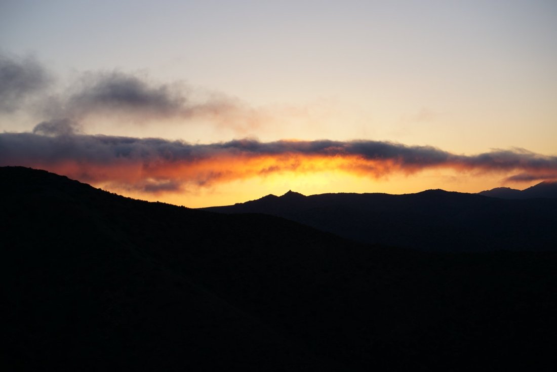 So, when we said we had wanted to get an early start, 3am was NOT what we had had in mind! Minutes after 3am we woke to half of our tent collapsing due to the constant hurricane-strength winds- apparently our tent-site was not as ideal as we had thought, and our tent was not as indestructible as we had hoped. Matt threw on his shoes & headlamp to fix the tent only to find that a piece was beginning to rip from being pulled by the wind. He jumped back into the tent and announced, “we gotta get outta here!” Matt and I have NEVER packed so quickly. By 3:38 we were packed and hiking.