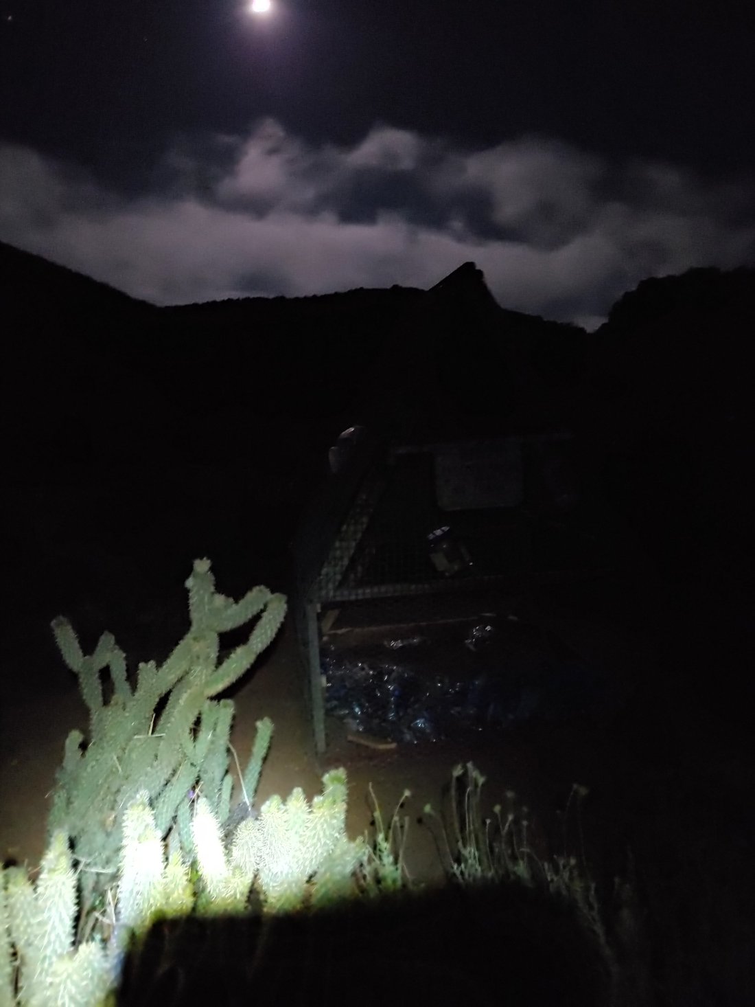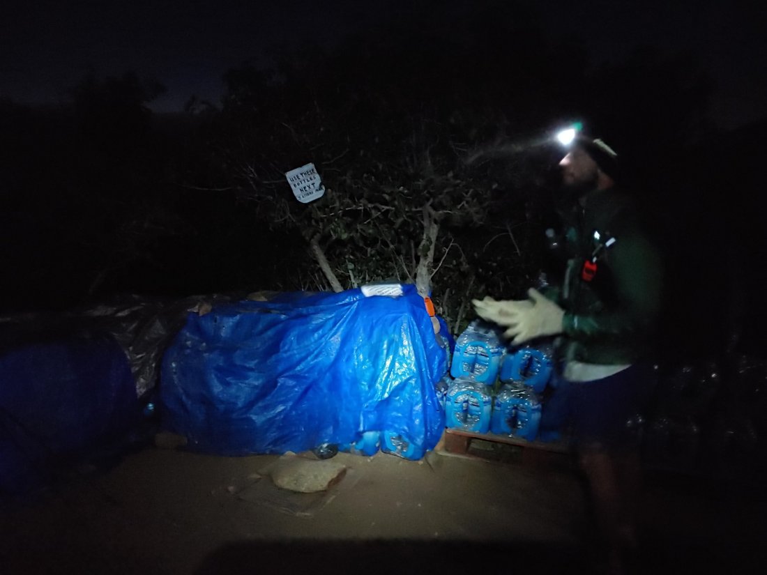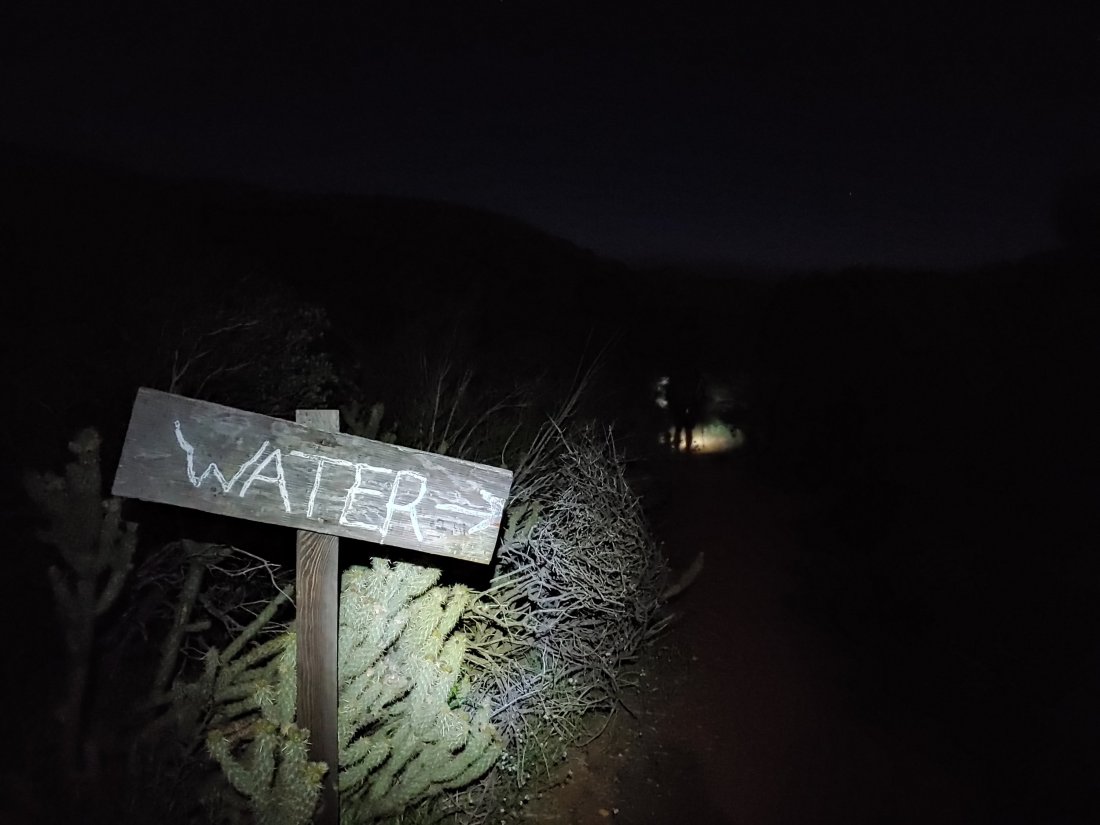 Around 5 am we reached mile 91, where we found the most amazing water cache ever: gallons upon gallons of water! We topped off our bottles so we were carrying 11 L between the two of us. We were too cold and tired to donate at the cache, so we both donated via venmo later that night.