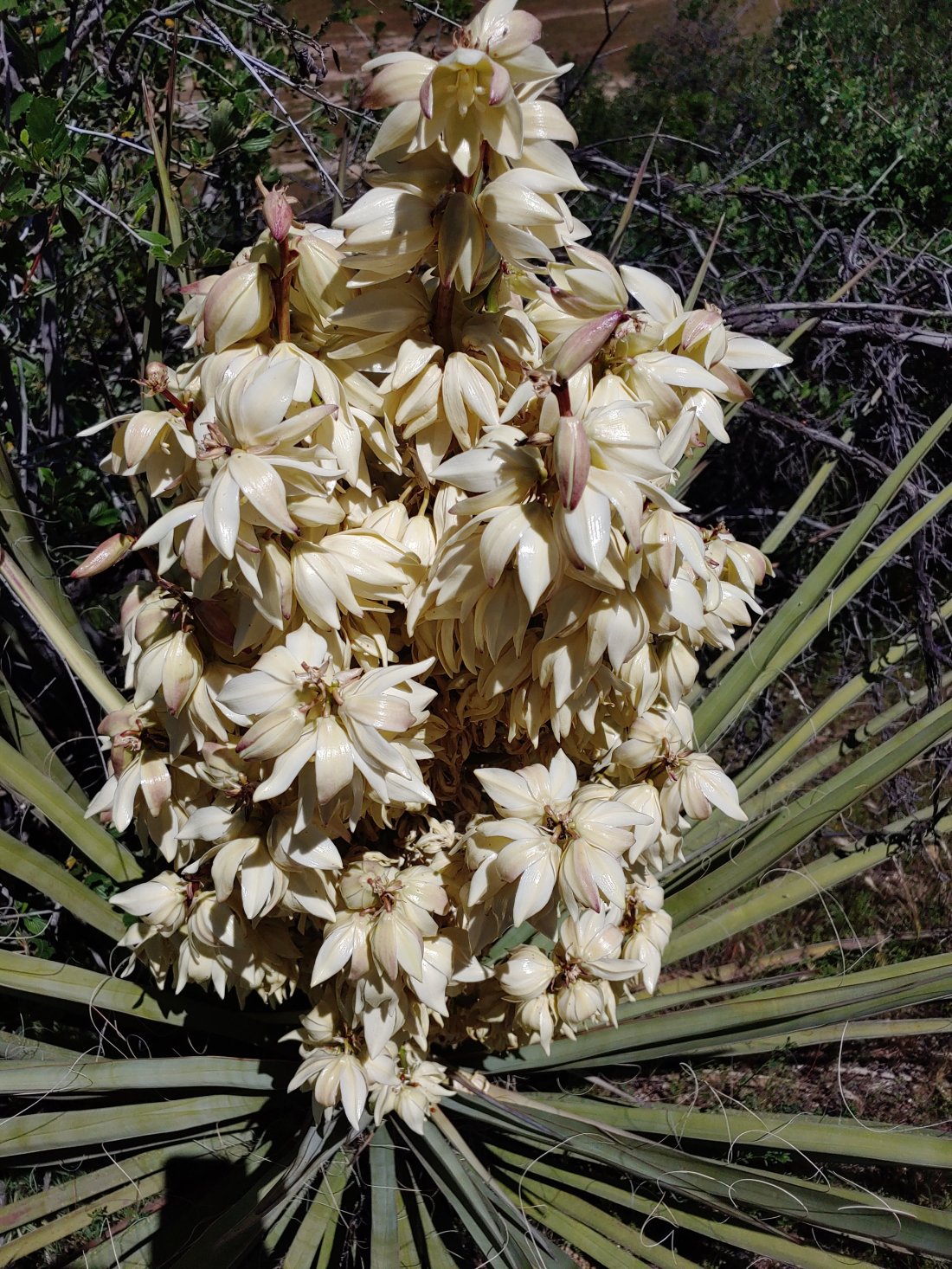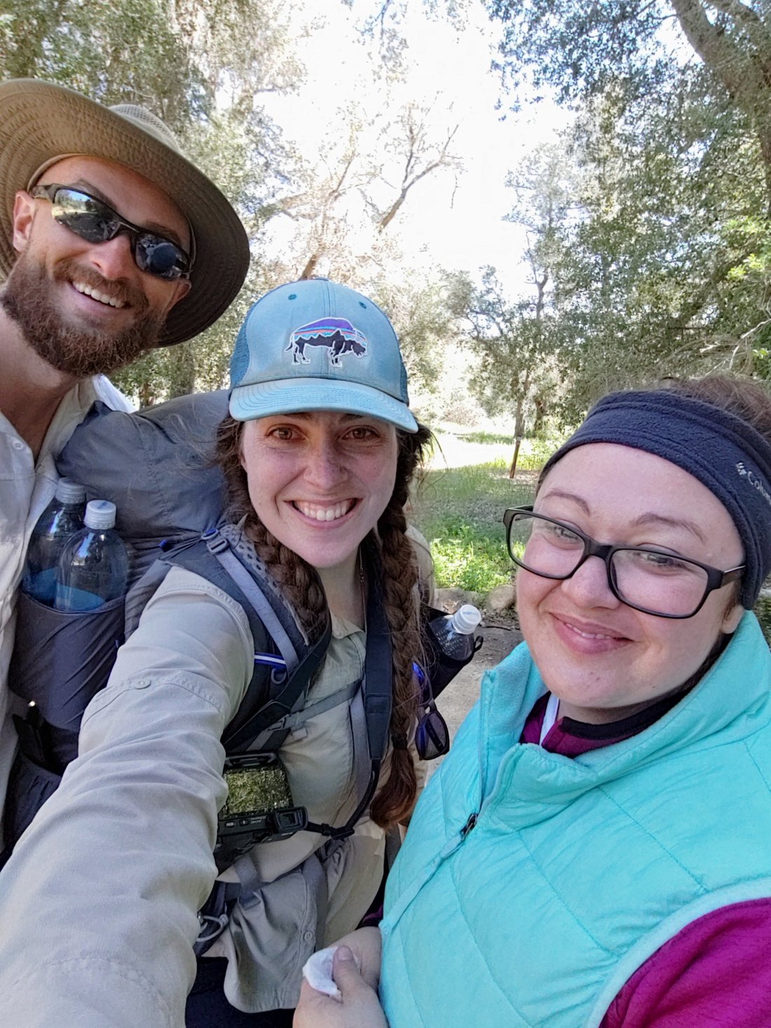 (Apparently selfies = mirror images!)Shortly after the 100 mile mark we stopped for a break and to apply sunscreen. There we met Charise and Tim, a married couple from Wisconsin, and Isaiah, a young dude from Orlando . We talked about the rumors of food and foot baths waiting for us in Warner Springs, which sealed the deal for Matthew and I trucking through. Charise mentioned how she was craving hot dogs, so I told her I’d put some good vibes out to the universe for hot dogs in her near future. We also wondered if it being Easter would limit the services available when we arrived in Warner Springs- then we joked maybe we would come across some peeps and jelly beans…
